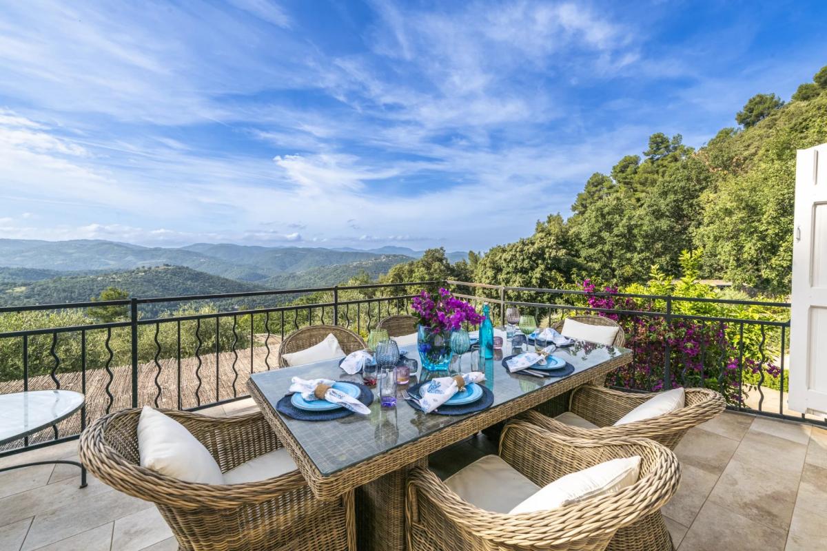 This property, perched in a commanding position, offers breathtaking panoramic views of the surrounding hills and the Mediterranean Sea. The 6000m2 plot, adorned with ancient olive trees and various Mediterranean plants, creates a peaceful and authentic atmosphere. The perfectly maintained garden, irrigated by a natural spring, remains lush and green throughout the year.