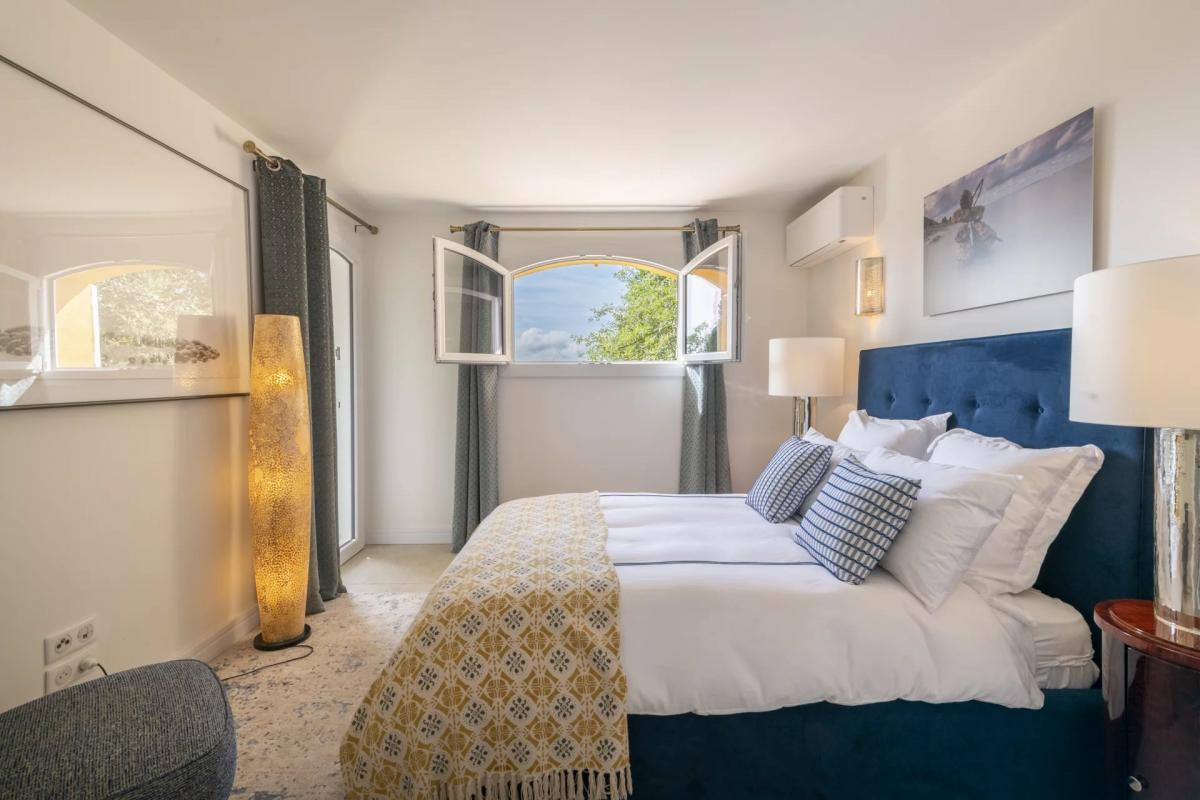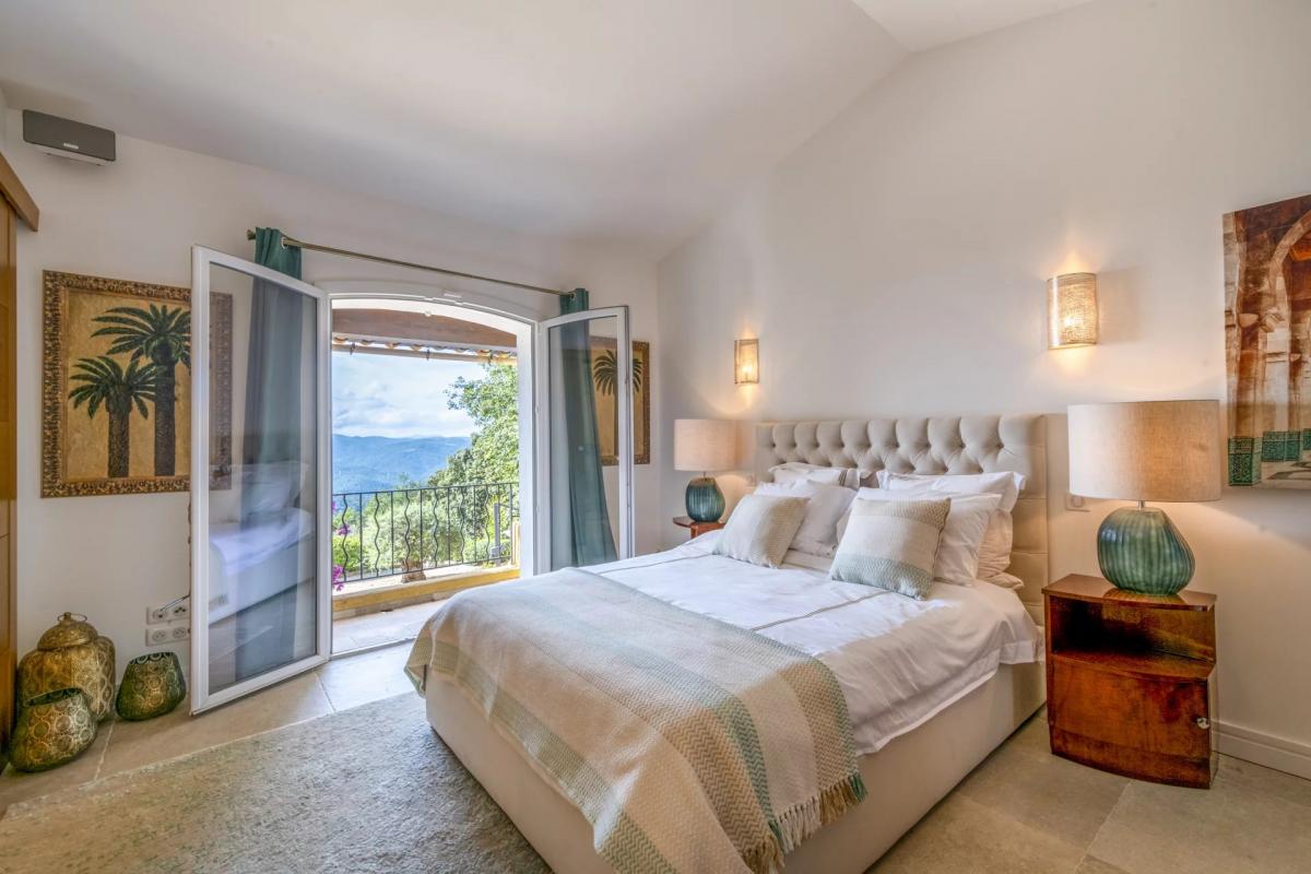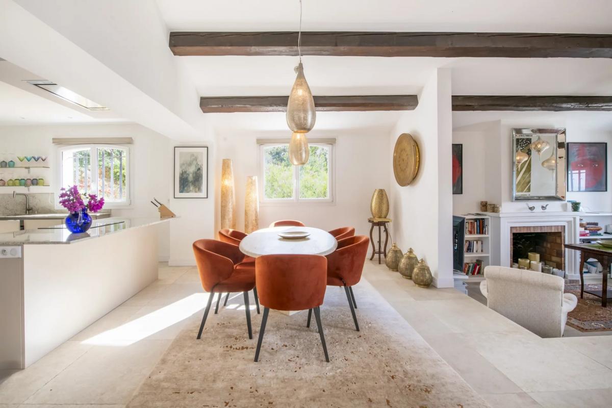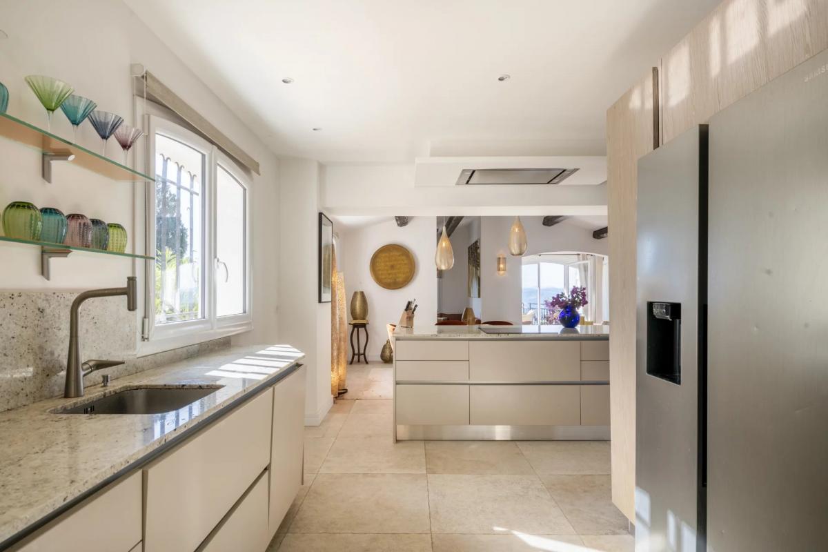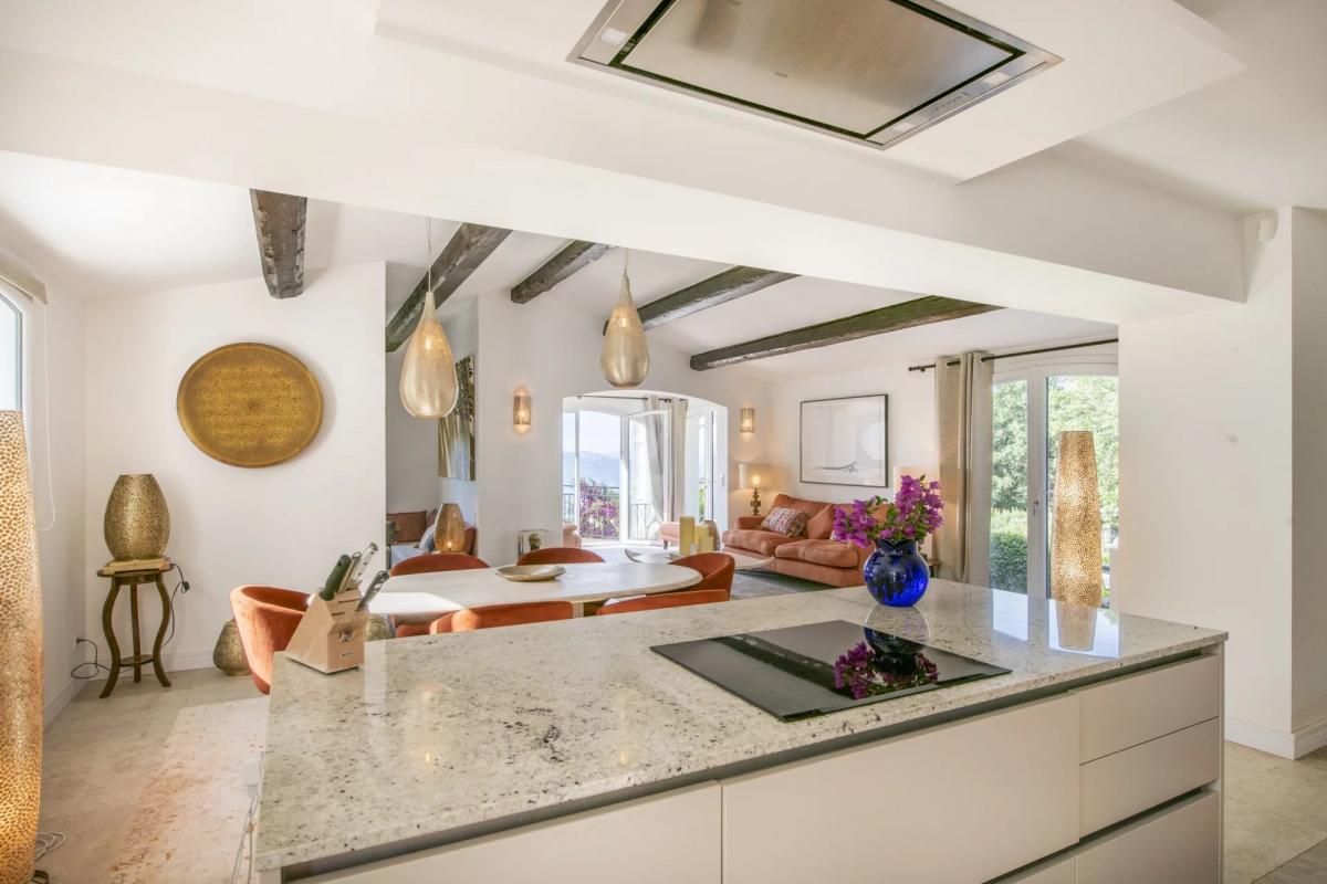 The interior, spacious and recently renovated, combines elegance with modern comfort in a refined decor. The house features an open-plan kitchen and living room that extends onto a terrace with expansive views. There are five en-suite bedrooms, with two in the main house and three independent, making it ideal for families seeking a balance between privacy and togetherness.