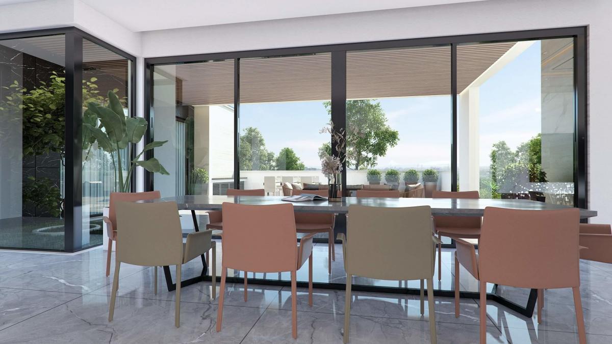 The dining area is open plan with another living room, which opens up to the swimming pool area.