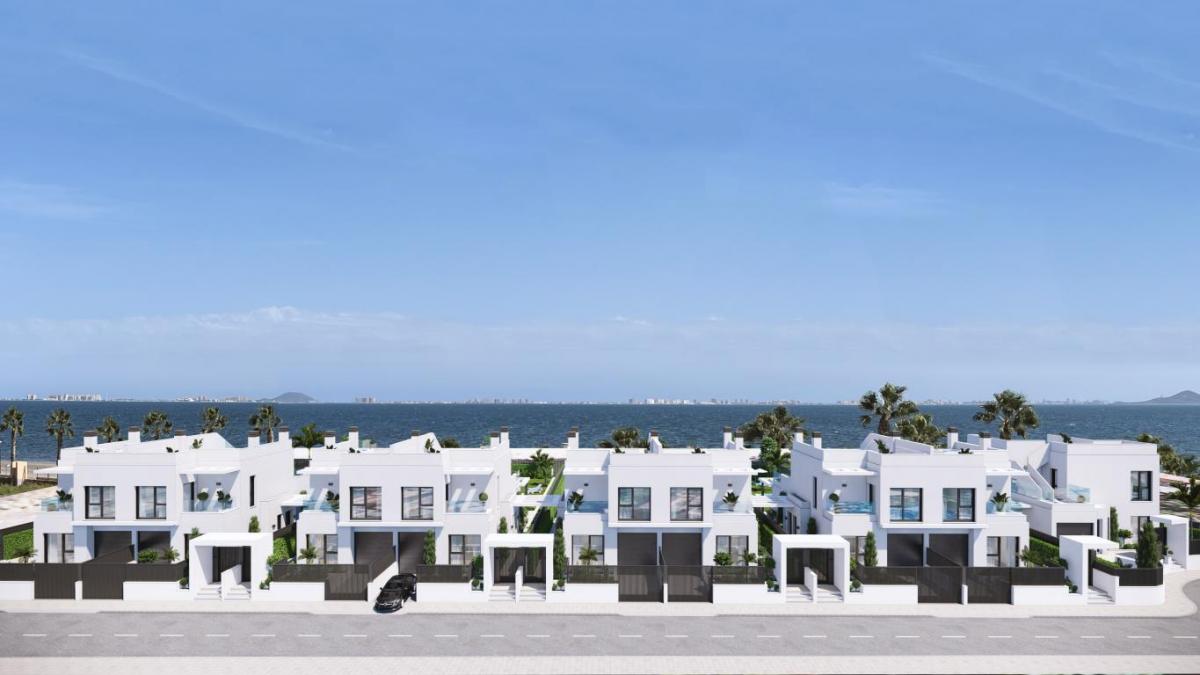 Experience unparalleled coastal living in these exclusive, newly built villas nestled in the captivating village of Los Alcazares, Murcia, Spain, directly bordering the tranquil Mar Menor. Imagine stepping out your door and onto a 4km promenade, your personal front-row seat to breathtaking sea vistas. As dusk settles, prepare to be enchanted by a truly unique spectacle - the distant skyline of La Manga, illuminated against the night sky, mirroring the iconic allure of New York City's skyline reflected over the water.These luxurious beachfront residences, each commanding a generous 300m2 plot, offer unrivaled direct access to the promenade and spectacular, unobstructed views that will captivate you daily. Inside, discover a haven of sophistication with three spacious bedrooms, each boasting a private balcony designed to maximize those stunning panoramas. Three beautifully appointed bathrooms ensure comfort and convenience for residents and guests alike. Effortless living is further enhanced by a private garage, while the expansive roof terrace, complete with a jacuzzi, provides the ultimate setting for relaxation and entertaining under the Spanish sun.