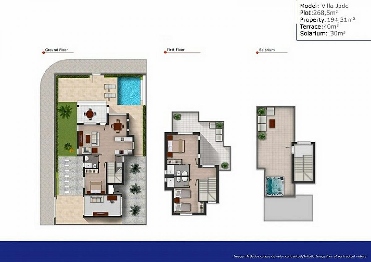 These superb 3 bed detached villas benefit from large private plot, terraces, garden and solarium. The villas also include private swimming pool