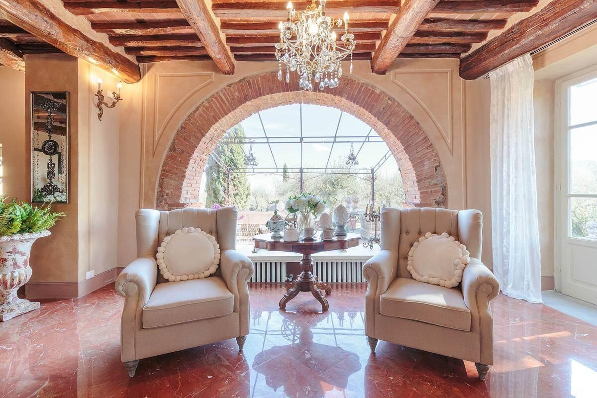 Located amidst the lush hills of Lucca, just 10 minutes from the historic city center, this stunning 17th-century villa has been meticulously restored, preserving its historical charm while providing modern comforts. With a total surface area of approx. 900 sqm, the property spans three main floors, offering an elegant and spacious layout that can accommodate up to 20 guests. The ground floor features large, bright living rooms with historic fireplaces, perfect for entertaining or relaxing. The professional kitchen, complete with a fireplace and breakfast area, is ideal for family gatherings or hosting events. The sleeping area includes 10 beautifully furnished bedrooms, each with an en suite bathroom. The villa also features a wine cellar, study, and multiple reception spaces, making it ideal for elegant dinners or business meetings.