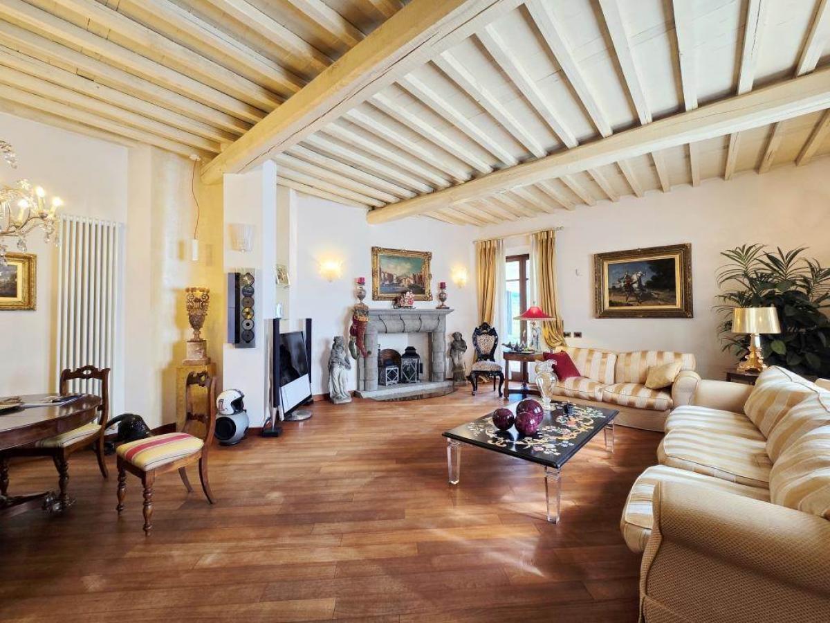 Finishes include light-colored wooden beam ceilings, parquet floors on the main levels, porcelain stoneware flooring in the basement, and travertine stairs. Windows are in wood with double glazing and shutters for excellent insulation.