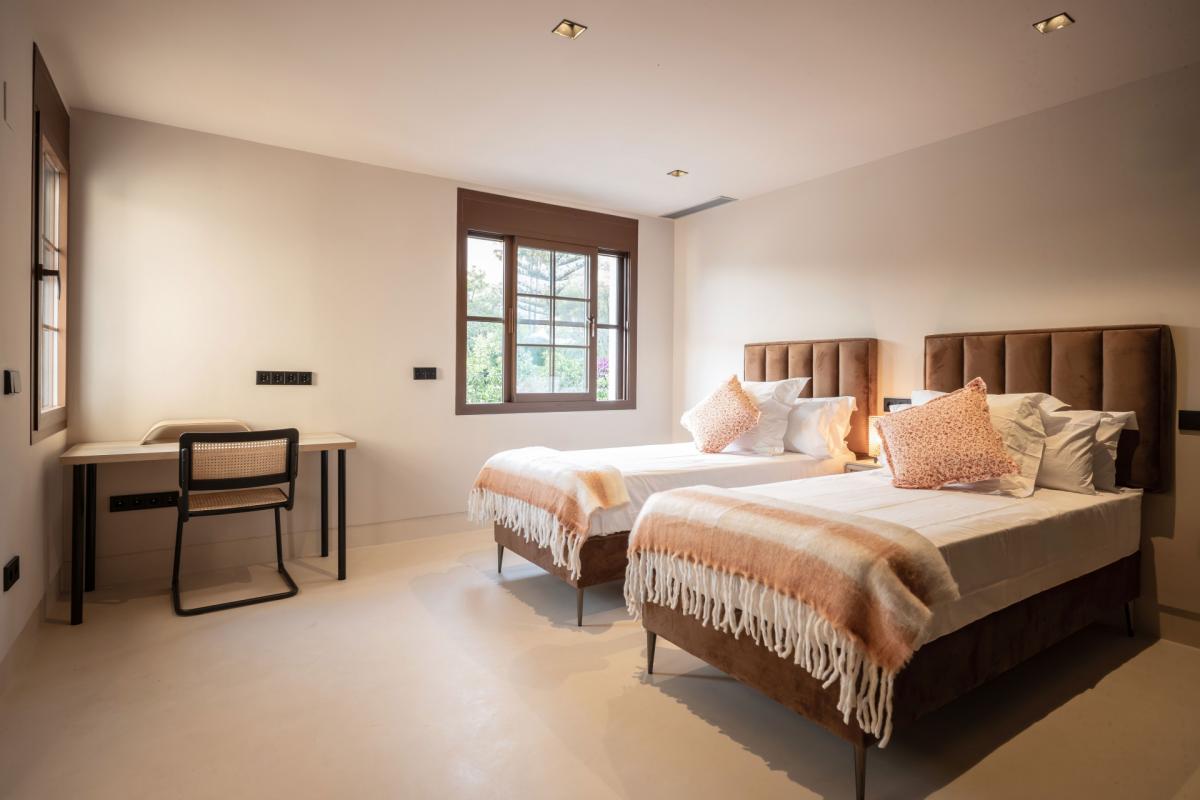 Located on a quiet street in the prestigious La Merced area, this breathtaking fully renovated villa is just a 10-minute stroll from the beach. Situated on a 1,251-square-meter southwest-facing plot, this modern masterpiece has been meticulously rebuilt to the highest standards, offering a perfect blend of luxury, comfort, and style.Spanning three floors and a rooftop terrace, the villa is seamlessly connected by an elegant staircase and a private panoramic elevator. The ground floor boasts a spacious open-plan living area, thoughtfully divided into a chill-out lounge, a cozy space with a fireplace, and a dining area. Step outside to the main terrace and take in views of the beautifully landscaped terraced gardens and the large pre-heated saltwater pool. This level also features a sleek, fully equipped modern kitchen with premium appliances and two en-suite bedrooms. An independent laundry area with a guest toilet is also conveniently located outside.The first floor offers three en-suite bedrooms, including a luxurious master suite complete with a walk-in closet, a private terrace with a jacuzzi, and picturesque views of the garden and partial sea vistas. The top floor is a rooftop terrace equipped with a shower, providing a serene spot to take in panoramic views of the surrounding area. On the lower level, youll find a TV room, a climate-controlled wine cellar, ample storage space, and a spa area featuring a gym, steam sauna, and Turkish bath. Parking is effortless with an indoor garage for two vehicles and additional space for four more on the driveway.This villa is outfitted with cutting-edge technology, including underfloor heating and cooling, an Airzone air conditioning system, state-of-the-art kitchen appliances, a home automation system, an electric car charging station, automated glass doors, and a private panoramic elevator. The stylish design effortlessly blends modern elegance with boho-chic details, creating a warm and inviting ambiance.This extraordinary property offers a rare opportunity to own a newly built, high-quality villa in one of Marbella's most coveted locations.
