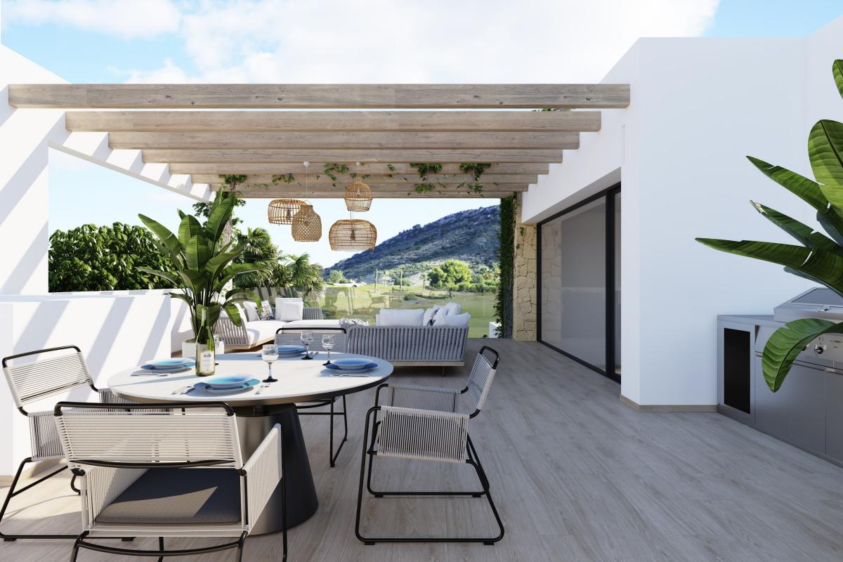 Villa Everest is a luxurious property set on a plot of approximately 900 m2, southwest facing, allowing you to truly enjoy the Spanish sun all day long long, with amazing views of the golf course and surrounding mountain ranges. This villa is distributed over two levels, with spacious and open living areas with natural light, where most of the rooms overlook the golf course. On the ground-floor is the living room with large windows creating an atmospheric living space, with an adjoining open-plan island style kitchen. The master bedroom offers beautiful golf views with a separate dressing room and bathroom. in addition, there are two fully fitted bedrooms and a second bathroom. The property also features a garage in the basement for 3 cars. On the upper floor, there is a second master bedroom with en-suite bathroom and dressing room which is accessed via the beautiful staircase from the living room. This bedroom can also serve as an office or study room with direct access to the two beautiful terraces. The lower terrace is an extension of the living room, with large sliding windows and also has a separate barbecue. The spacious garden is located right next to the golf course with a large private swimming pool.The beautiful Font del Llop golf resort is strategically situated in the heart of the Alicante province. it is twenty minutes from the international airport of Alicante-Elche, twenty-five minutes from the centre of Alicante, twenty minutes from the centre of Elche and twenty minutes from the beautiful sandy beaches of the Mediterranean. Please contact us for more information. Prices subject to availability.