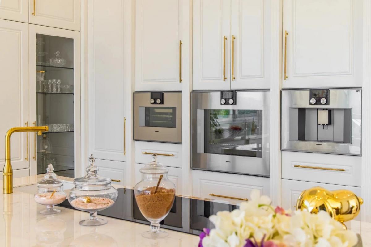 The villa instantly impresses with its double-height entrance hall featuring an impressive white marble wall. The expansive open plan living and dining area is incredibly bright and airy, thanks to its numerous bay windows which offer a striking view of the outside covered dining terrace, garden and swimming pool areas. The kitchen is tailor-made using premium quality finishes and appliances, including white marble worktops and gold tones throughout.