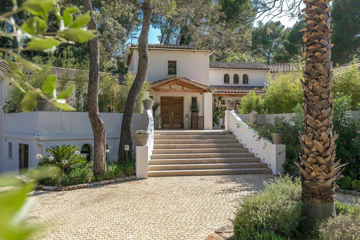 in the heart of one of the most residential and secure estates of Mougins, in a haven of tranquillity and surrounded by greenery, this superb property boasts top-quality fixtures and fittings and offers a very convivial quality of life, with the living space opening onto a large terrace with the swimming pool as well as a pool-house and the garden. The main villa of approx. 350 m2 is composed of spacious reception rooms, a large lounge with fireplace, a fully equipped kitchen opening onto the terrace, 5 en suite bedrooms, including a beautiful master suite with bathroom and small lounge. it also includes a gym area and a garage. The guest flat comprises a living room with kitchen and two bedrooms with en suite shower rooms.