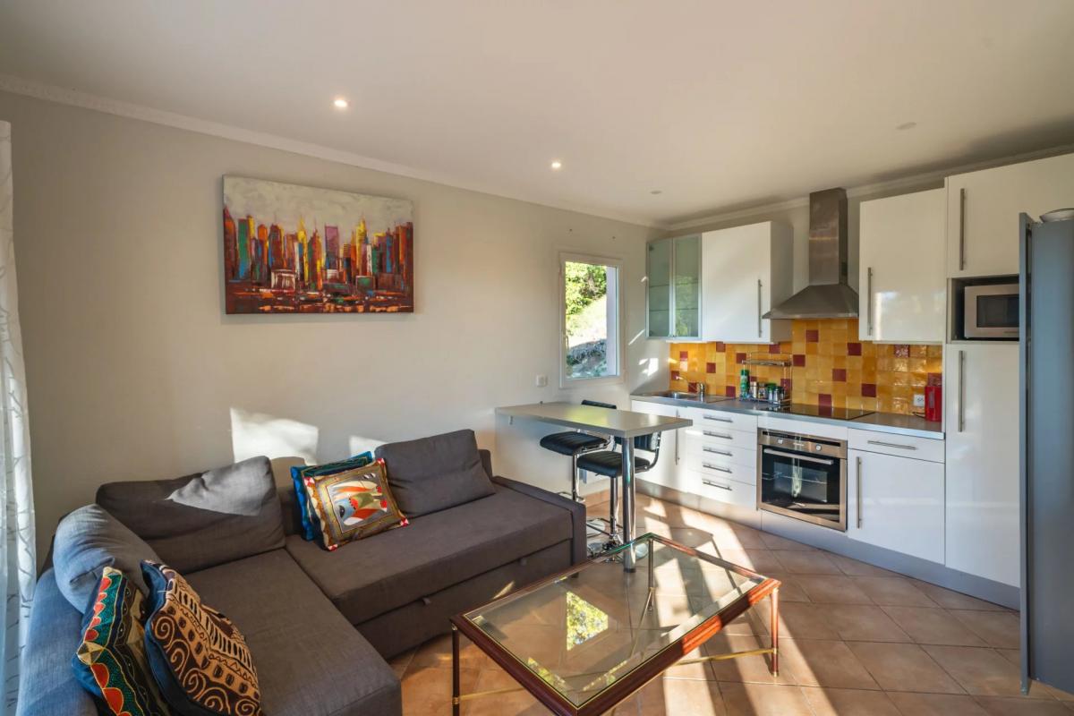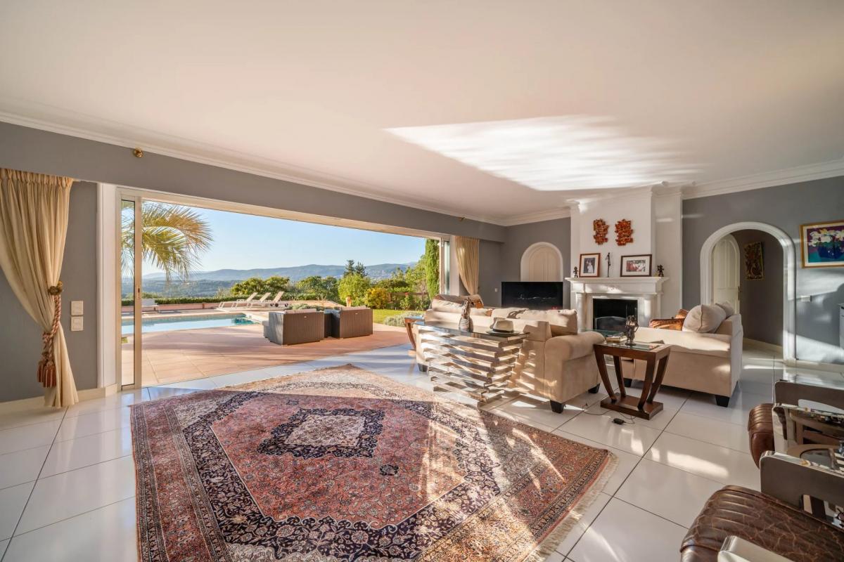 Nestled on more than 7,500 square meters of land, the estate boasts panoramic views and Provencal landscaping. Additional amenities comprise a double garage and outdoor parking for several cars.