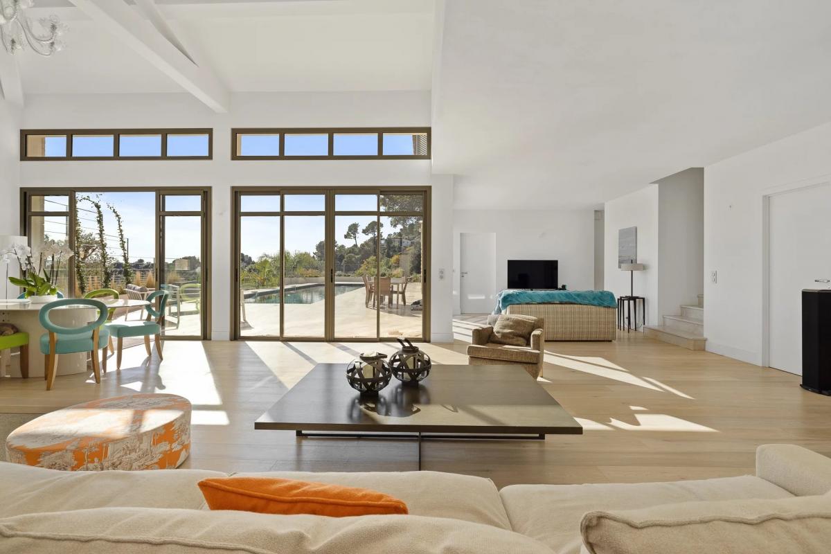 This newly built villa of about 365 sqm is facing south and is composed on the ground floor of a beautiful reception with a cathedral living room and a large kitchen opening onto the pool and the garden as well as a beautiful master bedroom. On the first floor there are three bedrooms with bathroom or shower and on the ground floor an independent flat, a large garage for up to 5 cars and plenty of storage space.