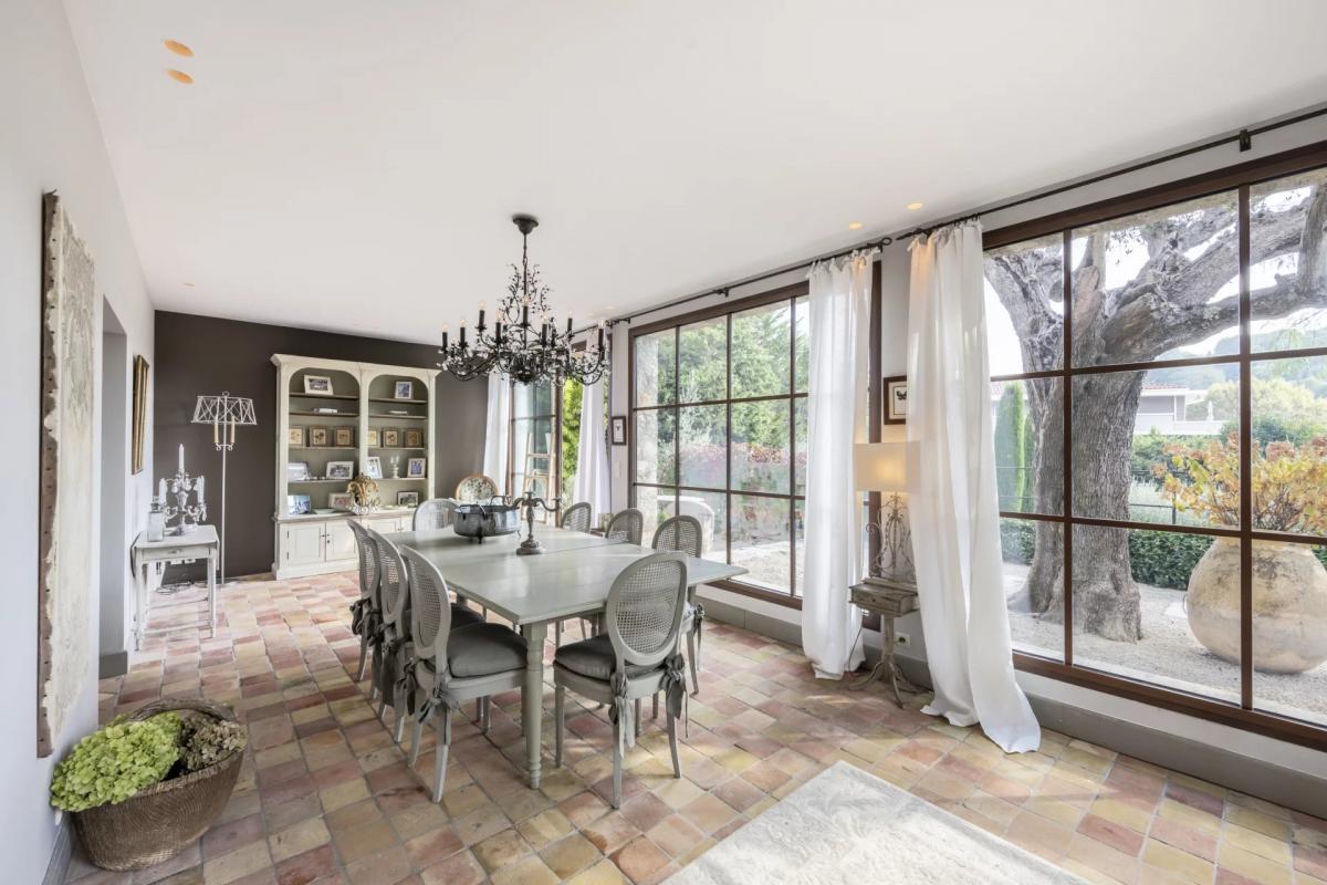 Turning right from the hallway, one enters a double reception room with a TV nook and fireplace, followed by a spacious dining area with bay windows on three sides, offering delightful views over the garden. All the ground floor rooms open directly onto the secluded Provencal garden, which features a swimming pool and a covered outdoor pool house.