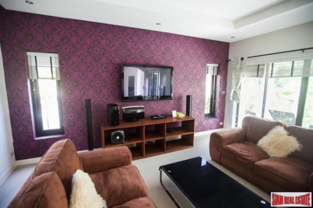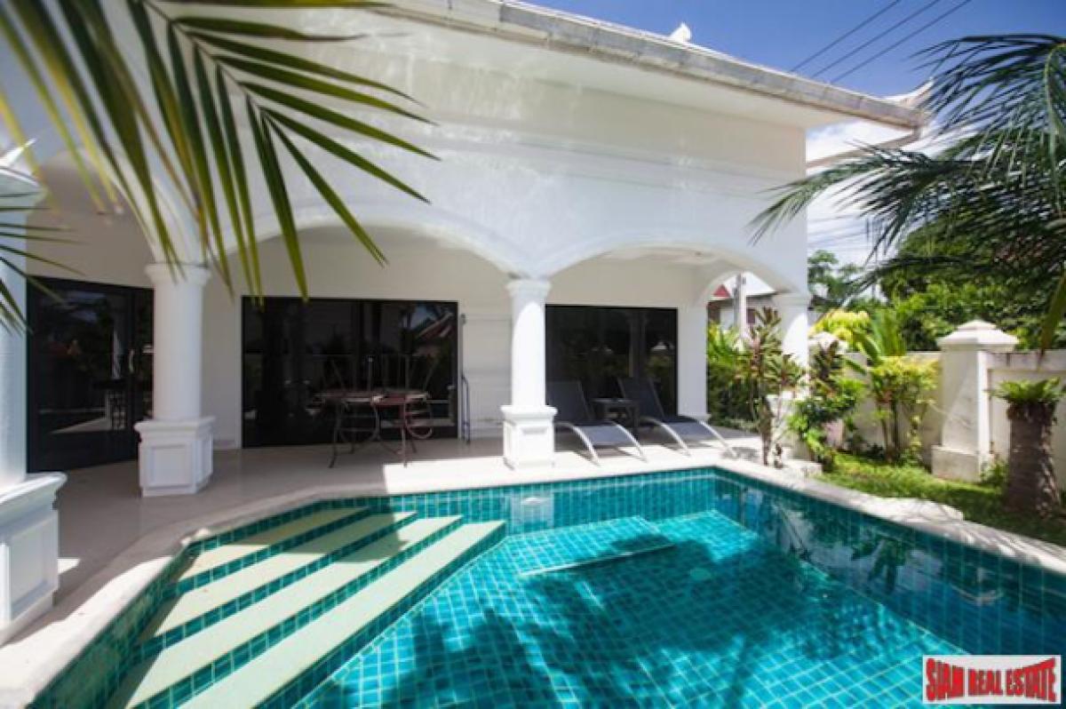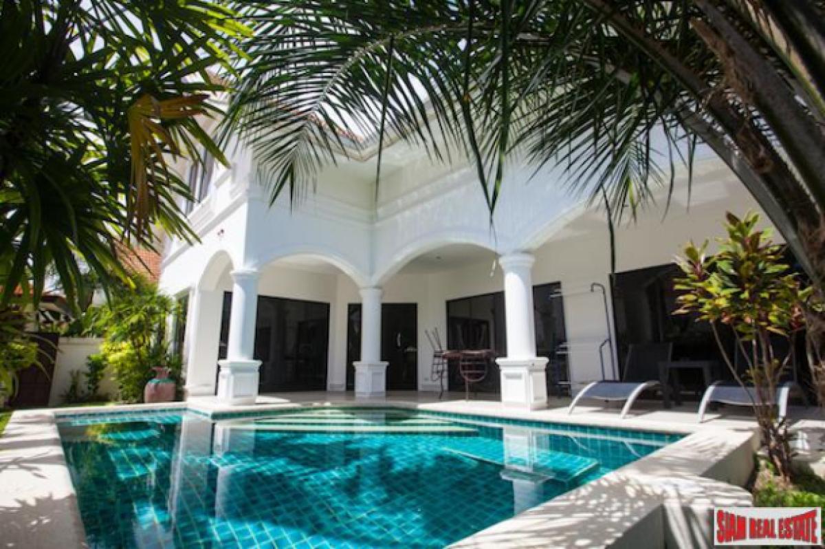 This three bedroom private pool villa is located in a prestigious boutique project very close to a secluded beach in Na Jomtien. The outside terrace is quite large with an outdoor dining table and lounge chairs.The home has a large living room with two sofas, coffee table and TV. There is a dining area and a big western kitchen. The fully equipped kitchen has cabinets and tiling that are in a rich brown tones.