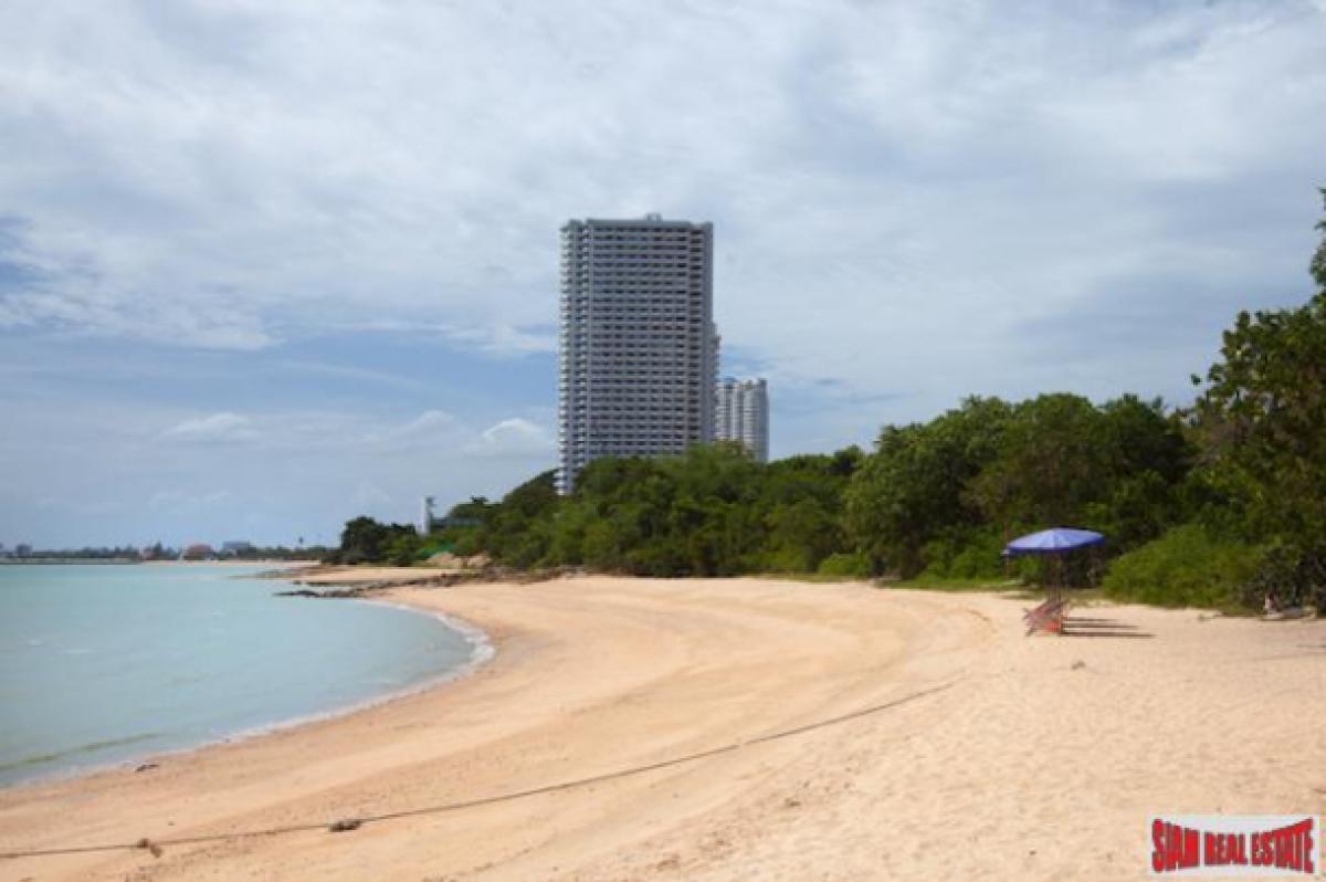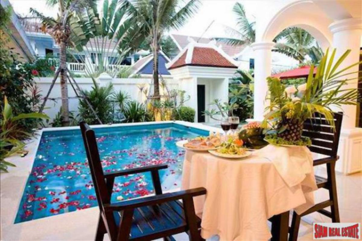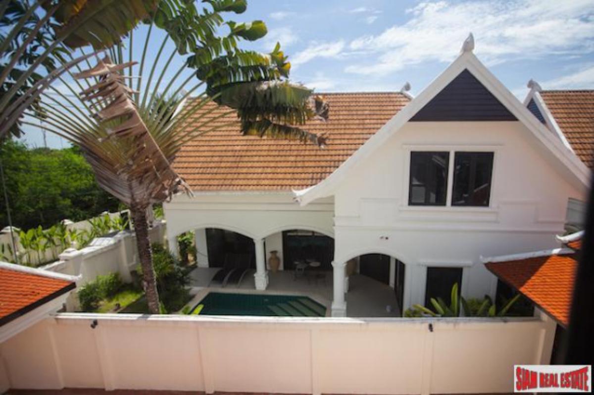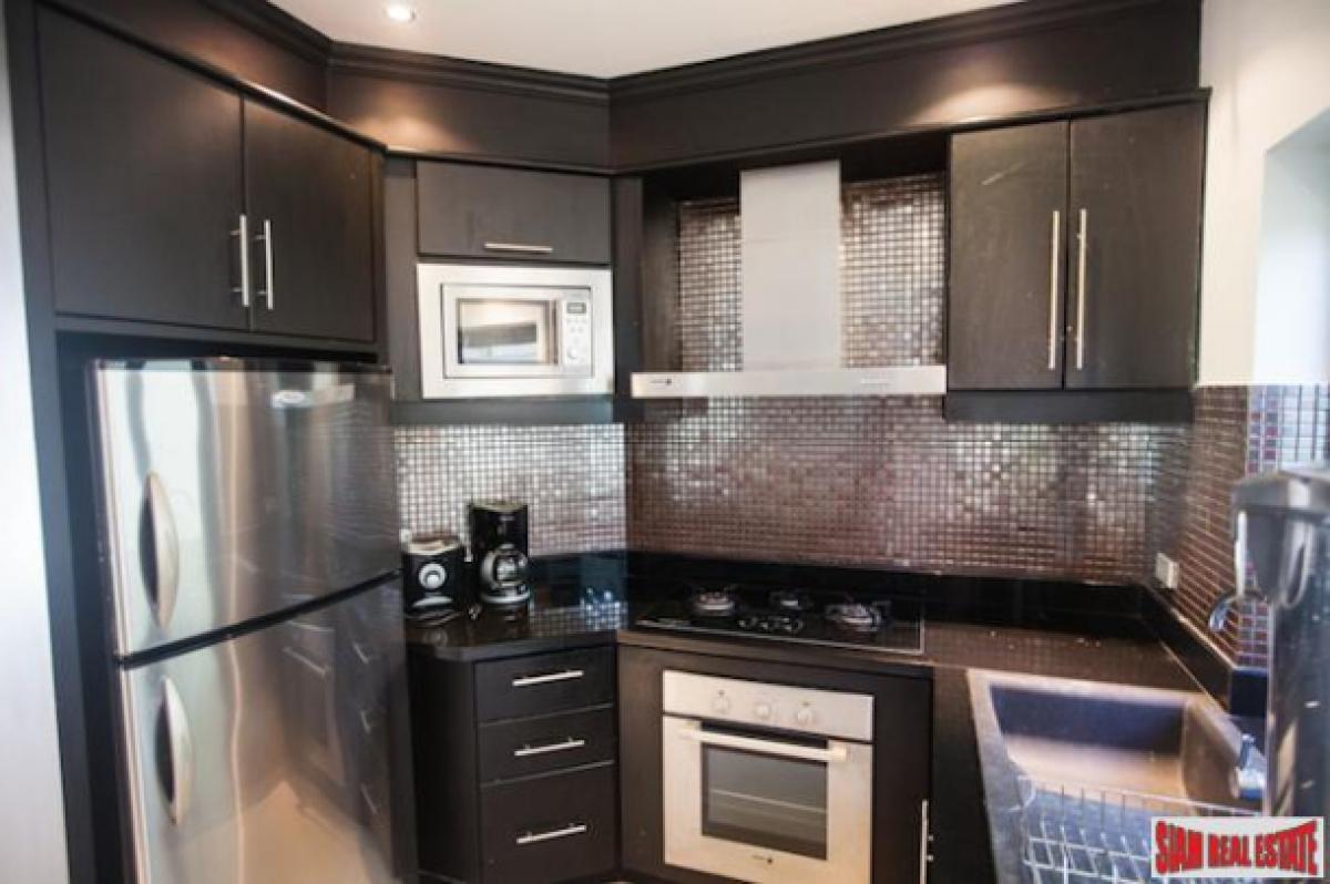 This three bedroom private pool villa is located in a prestigious boutique project very close to a secluded beach in Na Jomtien. The outside terrace is quite large with an outdoor dining table and lounge chairs.The home has a large living room with two sofas, coffee table and TV. There is a dining area and a big western kitchen. The fully equipped kitchen has cabinets and tiling that are in a rich brown tones.