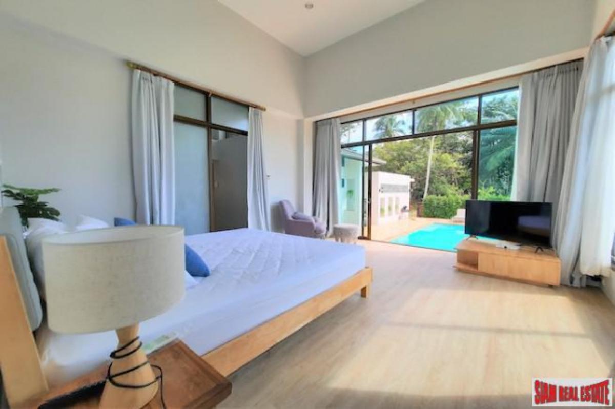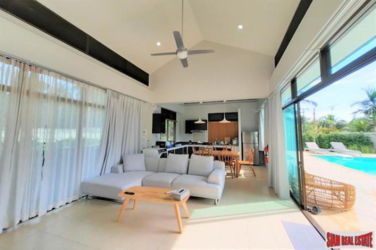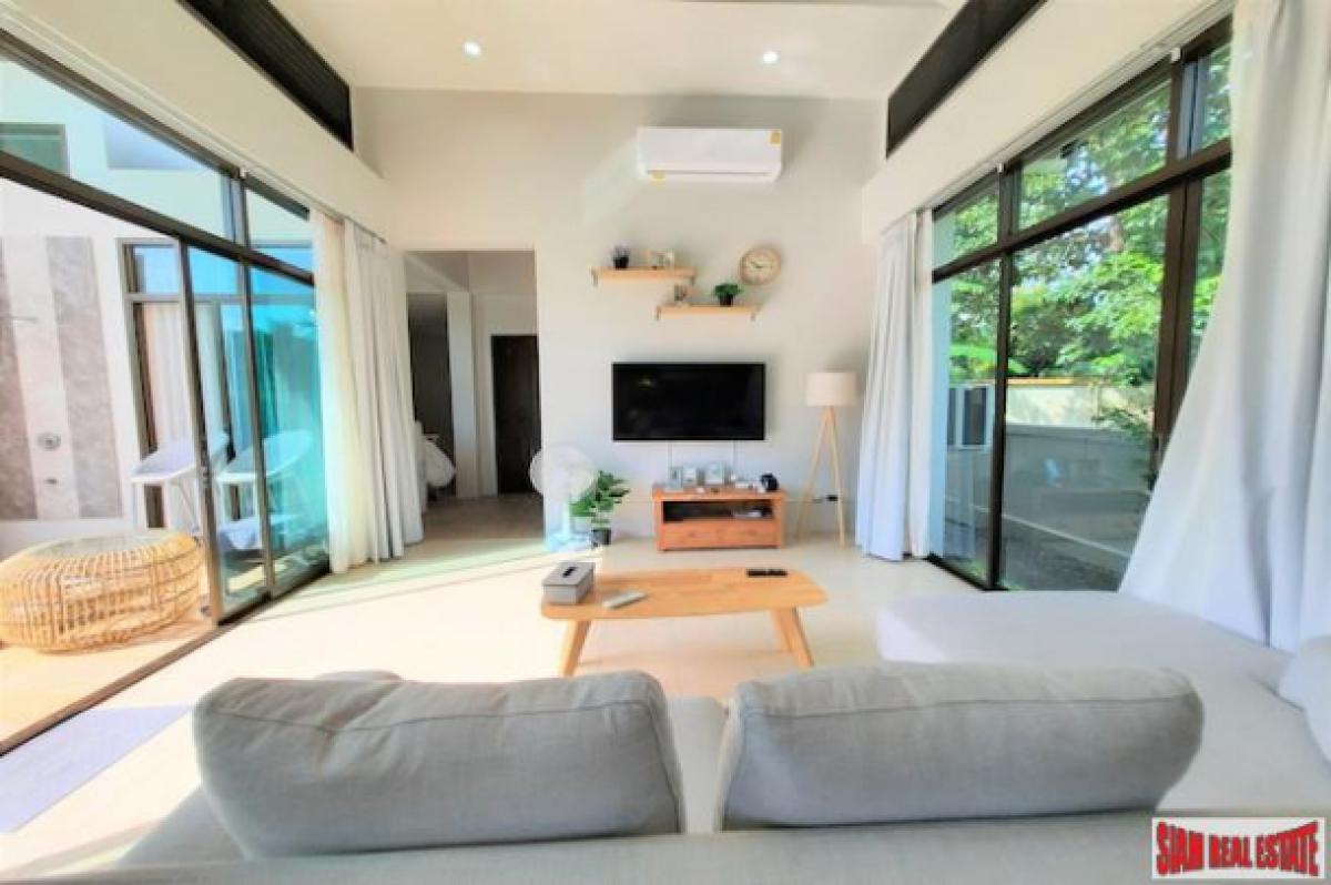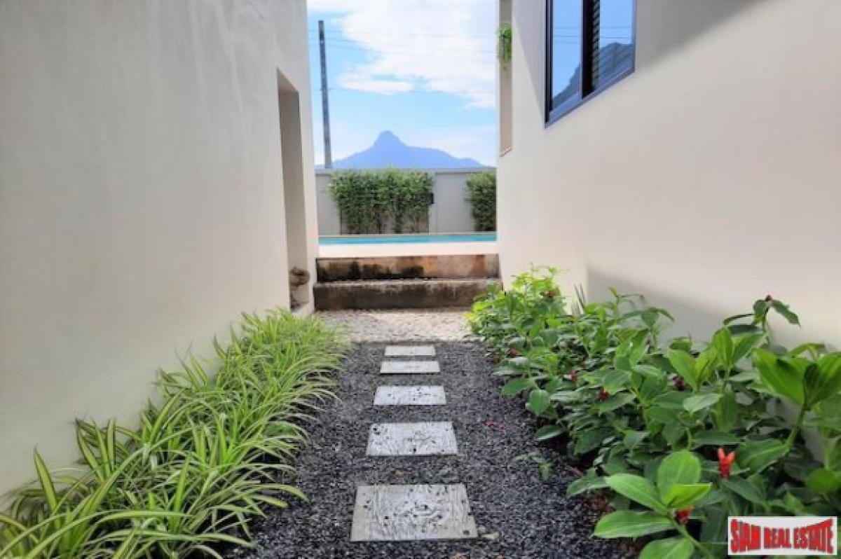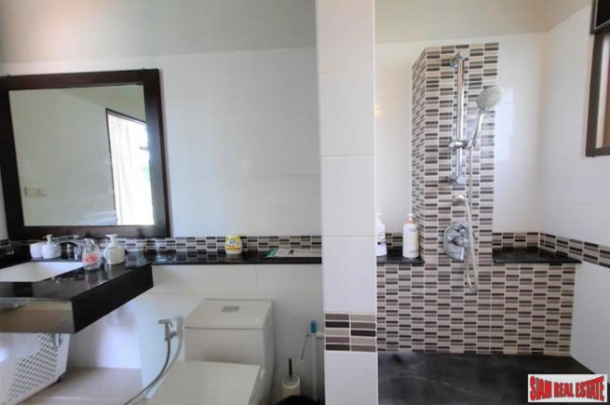 A bright and open three bedroom house with private swimming pool is for sale located in a quiet area of Nong Thaley. It is situated 300 meters from the main road, surrounded by green areas and beautiful mountain views.The living space includes the living room, dining area and fully equipped western kitchen which opens out through folding windows to the swimming pool, terrace and gardens. The kitchen is placed on the corner and has two windows with garden views. All three bedrooms are ensuite and have nicely tiled modern bathrooms.