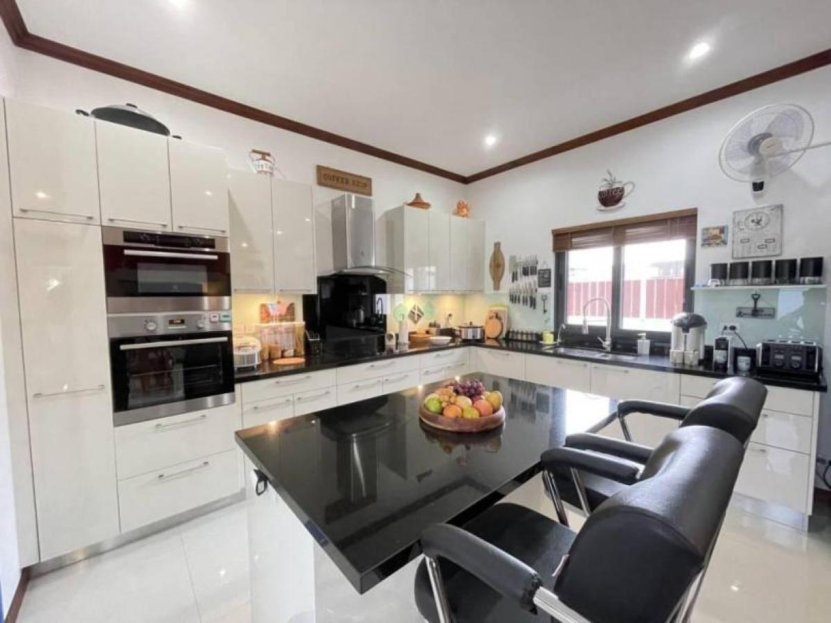 REDUCED FROM 13 MIO. THB TO 11.9 MILL. THB***** This pool villa is more than impressive. Already when entering the property you have the feeling to visit a newly built villa and not a villa that dates from 2014. This impression continues inside. Not only that it is in almost mint condition, but also the design and finish reflect the high standards and good taste of the owners. Since the entire area around the house is tiled, this house is looking for a new owner who does not want to spend the whole day gardening, but rather spend his days relaxing, sports and other activities to fill the precious time with beautiful things in life. The villa has a large open plan living-dining-kitchen area, the kitchen is European style and fully equipped, furthermore the villa has 4 bedrooms and 3 bathrooms. The master bedroom is equipped with a walk-in closet. One of the bathrooms even has a bathtub. A separate room for a maid with its own bathroom is available, or the room can also be used for fitness equipment. Outside there is a nice large covered terrace which is right next to the inviting large infinity pool. At the front of the house is a parking space which can be accessed through an electric gate. Some of the items and furniture in the house will be removed by the current owners, but much of it will remain in the house.- * Terrace
