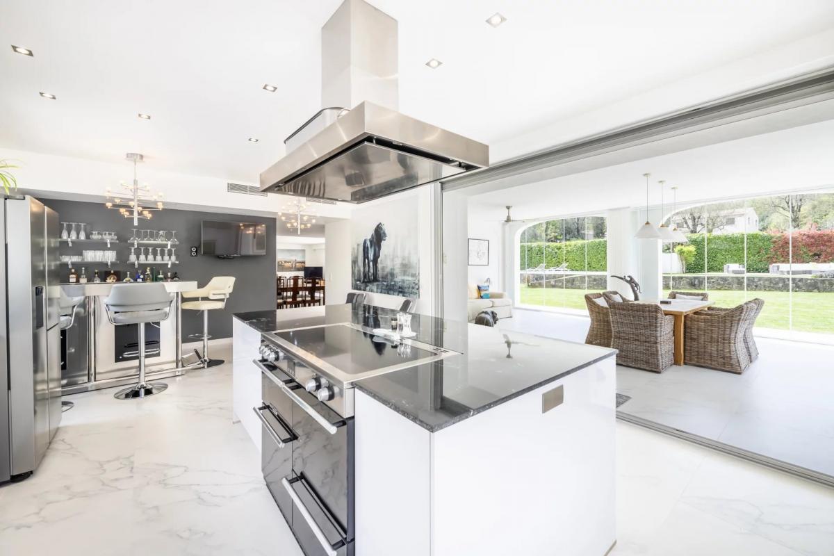 On the ground floor, you will find a sleek, fully equipped contemporary kitchen with a bar area, an adjoining dining room, a bright and spacious living room with a fireplace. The standout feature is the stunning summer living room with fully retractable windows, seamlessly connecting the indoors to the garden for true open-air living.