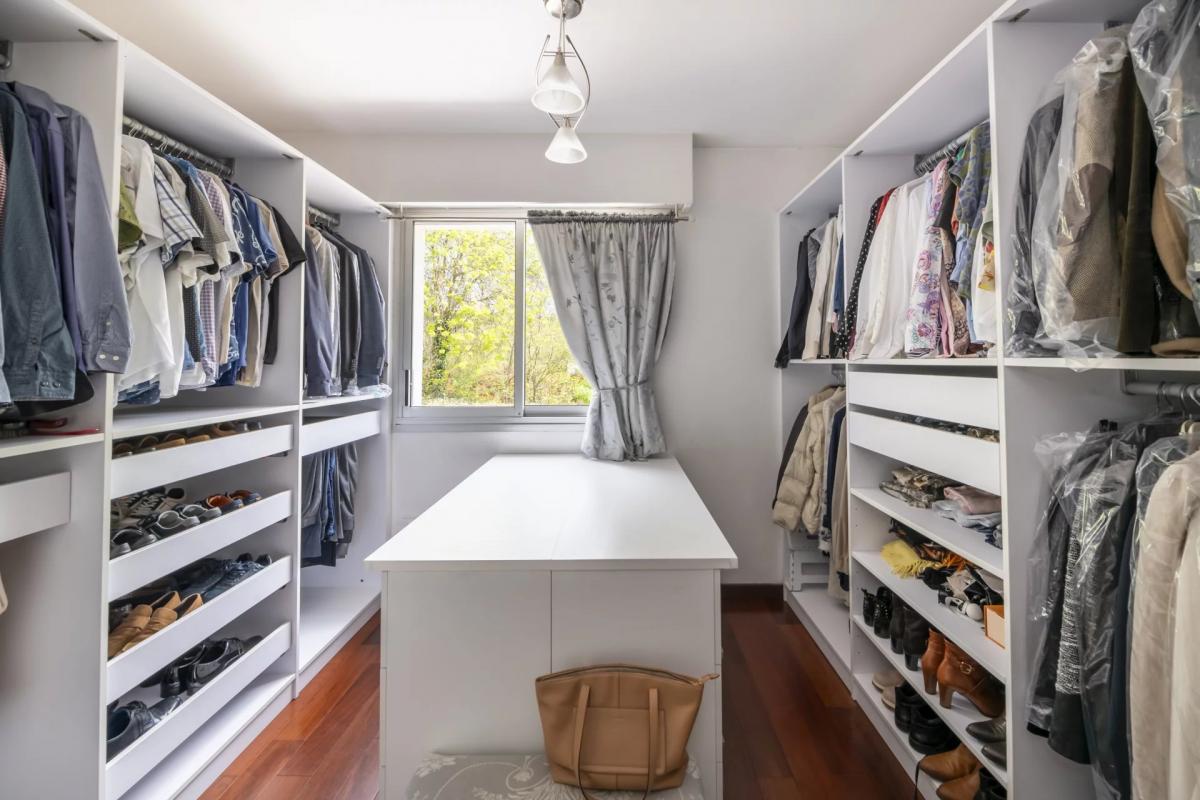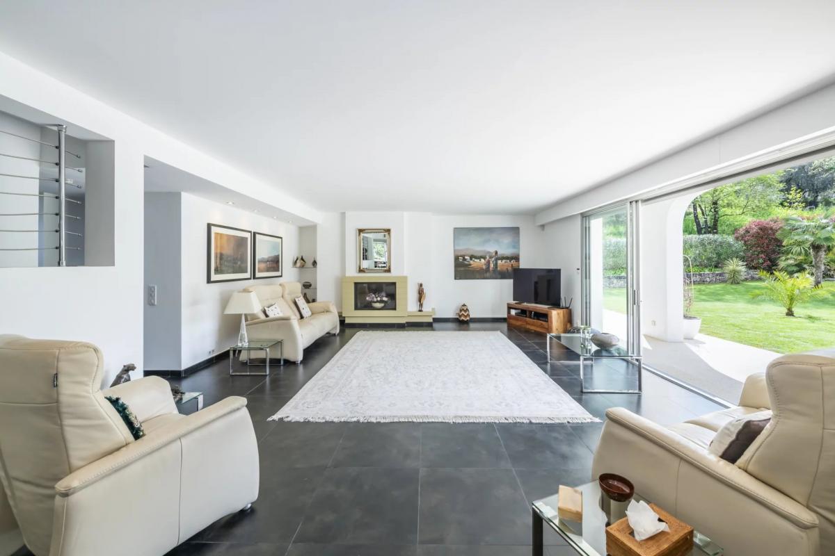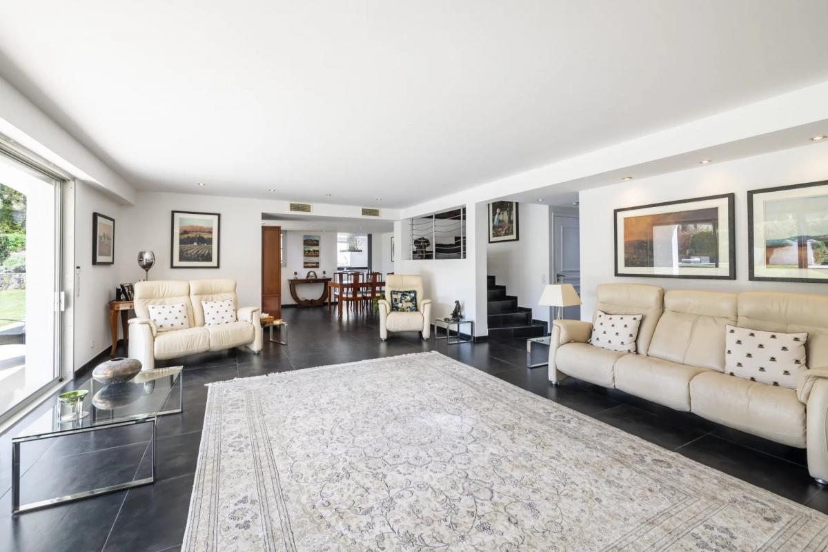 The lower level encompasses a large garage, laundry room, wine cellar, fitness area, extra storage space and an additional guest bedroom with an en-suite bathroom. Reversible air conditioning throughout.