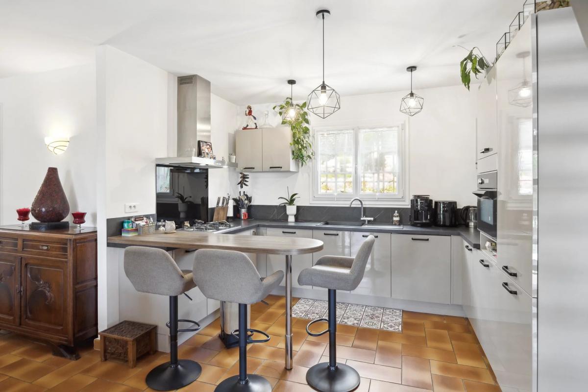 The exteriors are perfectly designed for relaxation, featuring an 11 x 5 m saltwater swimming pool, a summer kitchen with barbecue, a cellar, a double carport, and several lounging areas nestled in a Mediterranean-style garden.