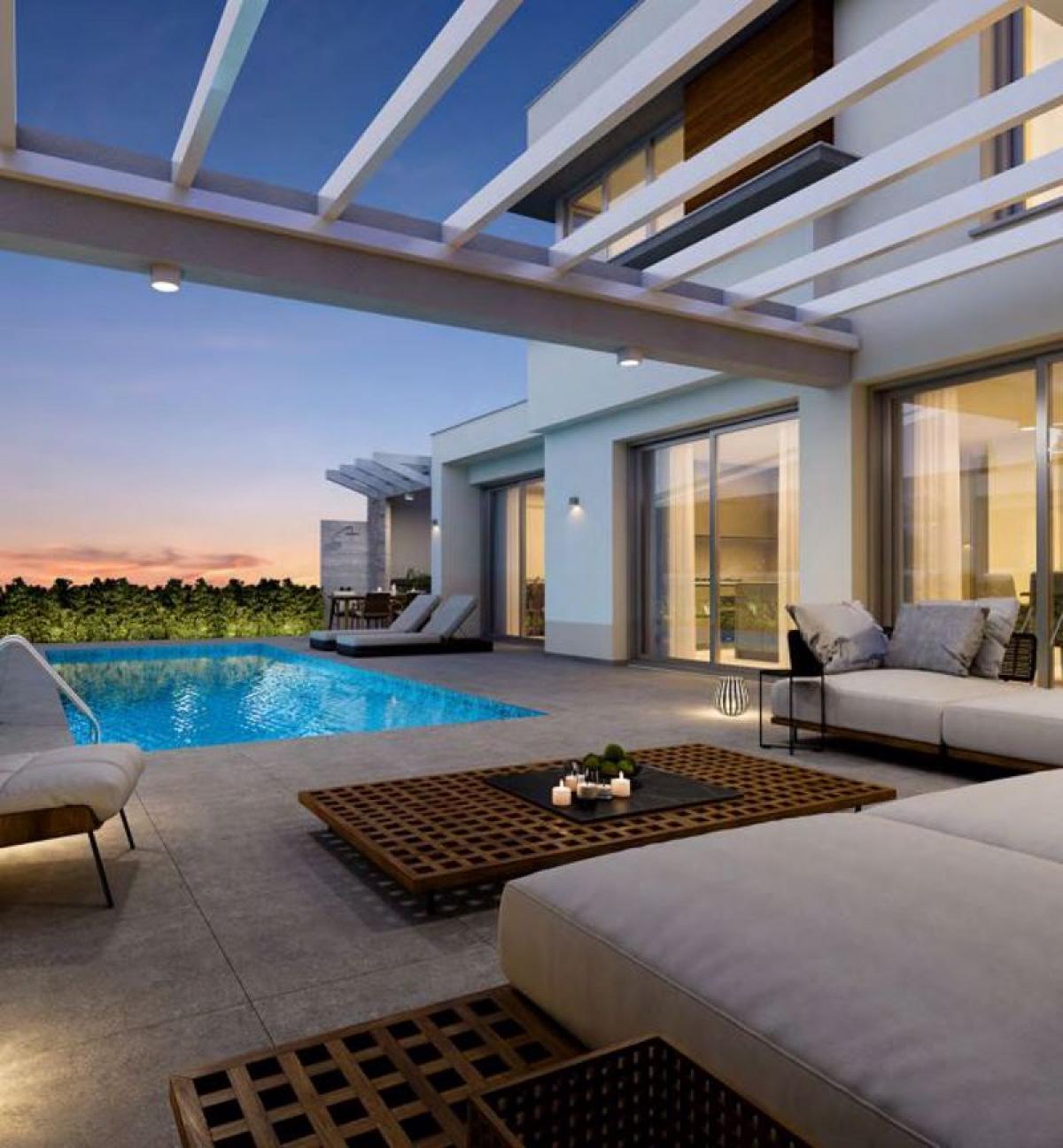 Striking facades feature accent natural stone and hardwood highlights. The distinctive roof on this villa overhangs and deep-set full-height windows on the ground floor and waist-height windows on the first floor allow maximum light to penetrate, whilst offering UV protection to furniture and fabrics. A walled garden contains a swimming pool, sun deck and outdoor dining area/bar. There is also a shaded off-street parking space for two vehicles. Generous living spaces present tremendous possibilities for owners to express their individual tastes. The open-plan ground floor areas are always bathed in light - well-suited to life in the warm Mediterranean region. Large sliding doors lead out to the sun terrace. Located in the village of Oroklini this villa is only a short drive away from the sea and beach.