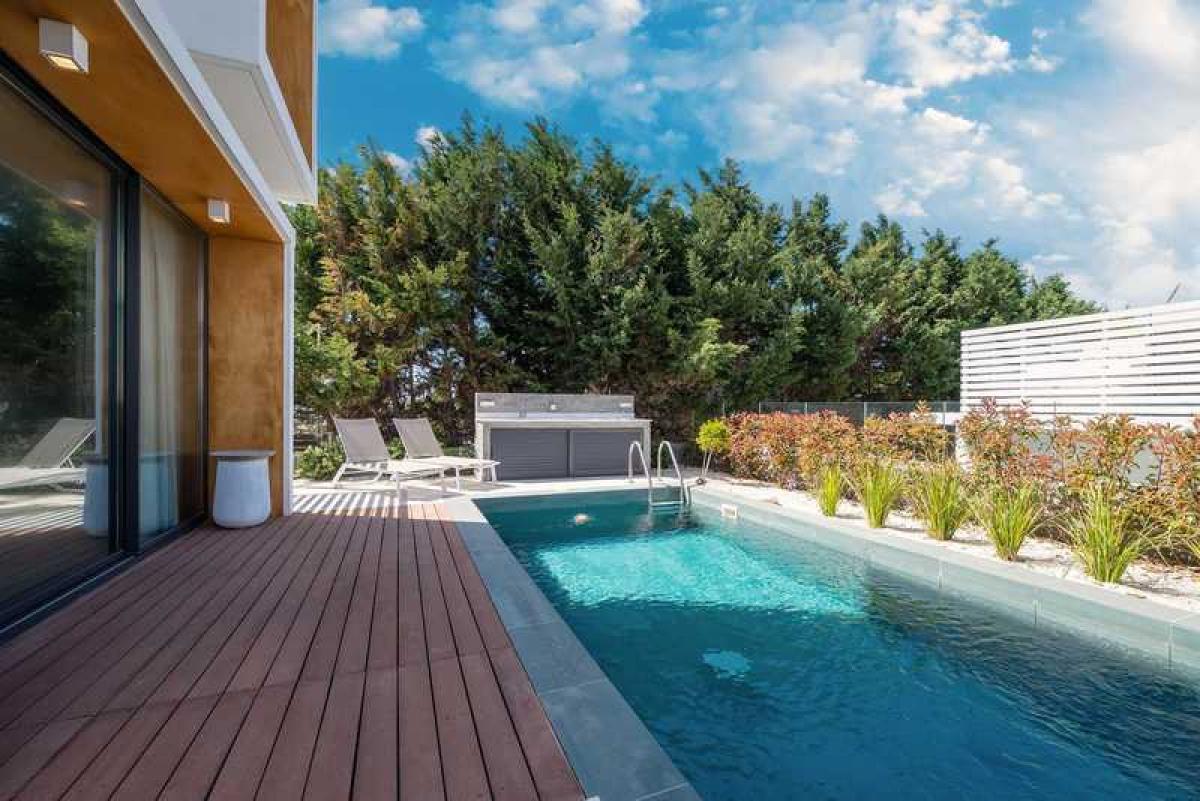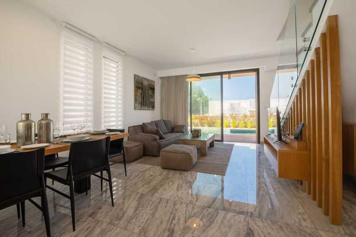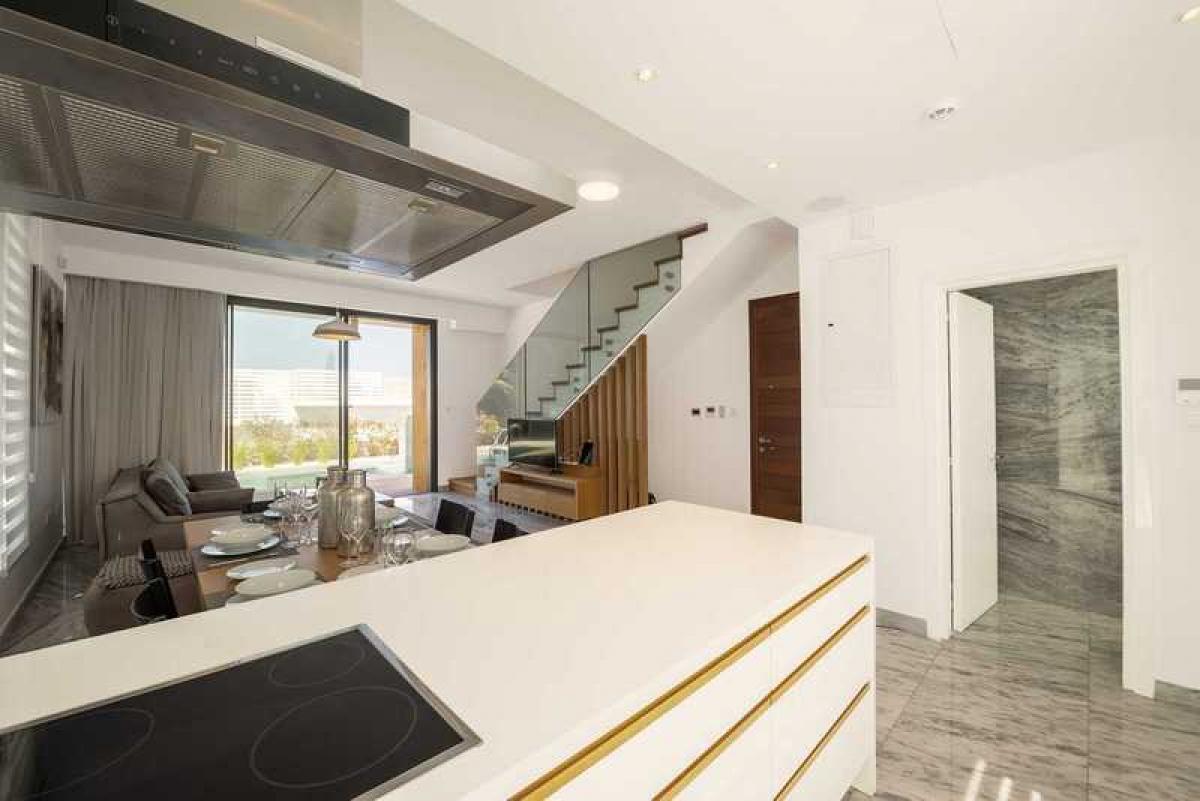 This modern, yet cozy and warm new villa is part of a small boutique development of only 7 villas in the heart of Pafos tourist area. It is located only 50 meters from the beach and within minutes walk to all facilities and amenities, including Kings Avenue Mall and 5 star Elysium hotel, restaurants, cafes, banks, schools etc.Downstairs there is an open plan lounge, dining area and kitchen as well as a guest toilet. Wooden stairs lead to the first floor with 2 bedrooms and 2 bathrooms. The villa has a private swimming pool and a barbeque area for those relaxing evenings outdoors.