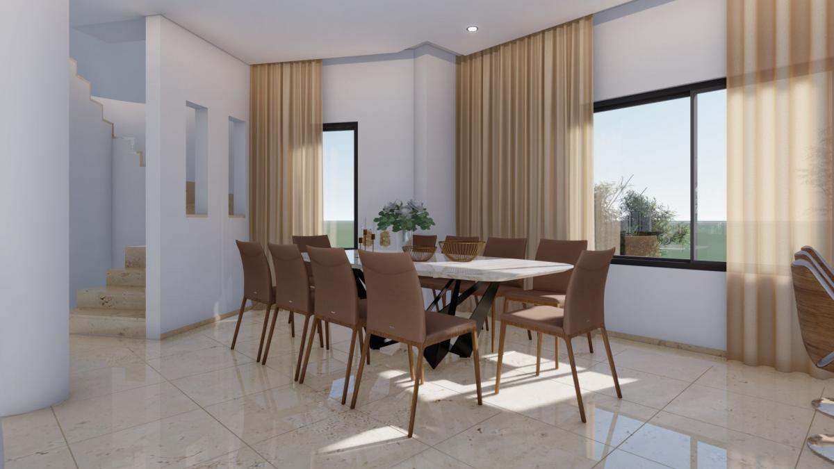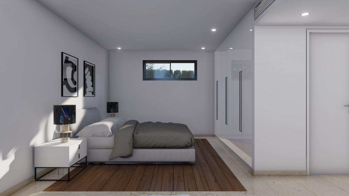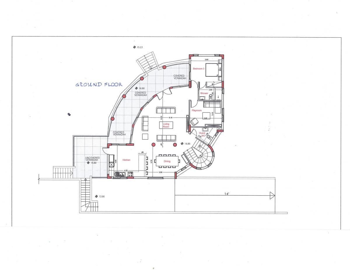 A spacious, open plan living / dining / kitchen area with large sliding doors opening onto a covered veranda running all along the front of the house, with views over the pool and down to the sea, are found on the ground floor, At this level there is also another en suite bedroom, a play room / bedroom and a guest WC.