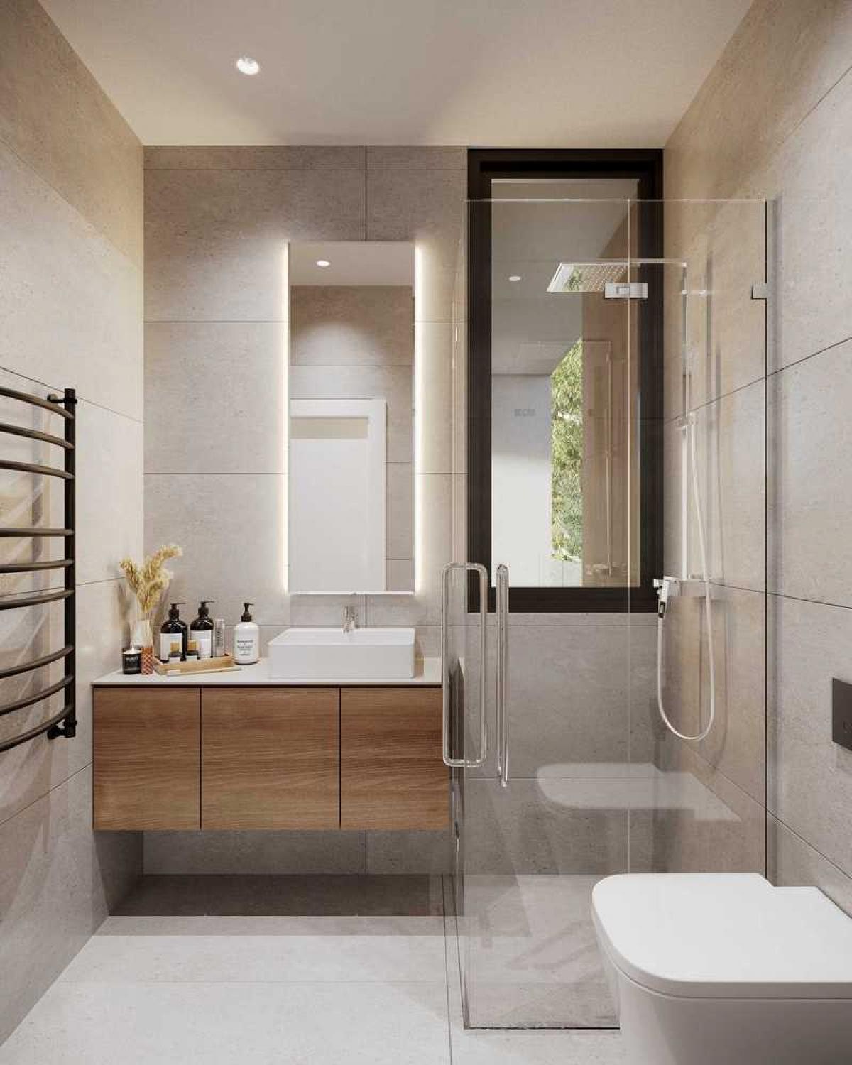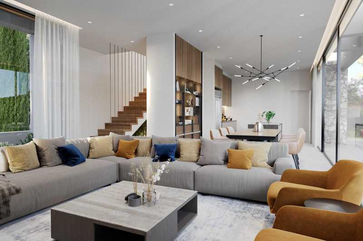 - The first floor showcases an impressive lobby, a living and dining area seamlessly connected to the kitchen, a guest bedroom with an ensuite wardrobe, and a bathroom with a shower