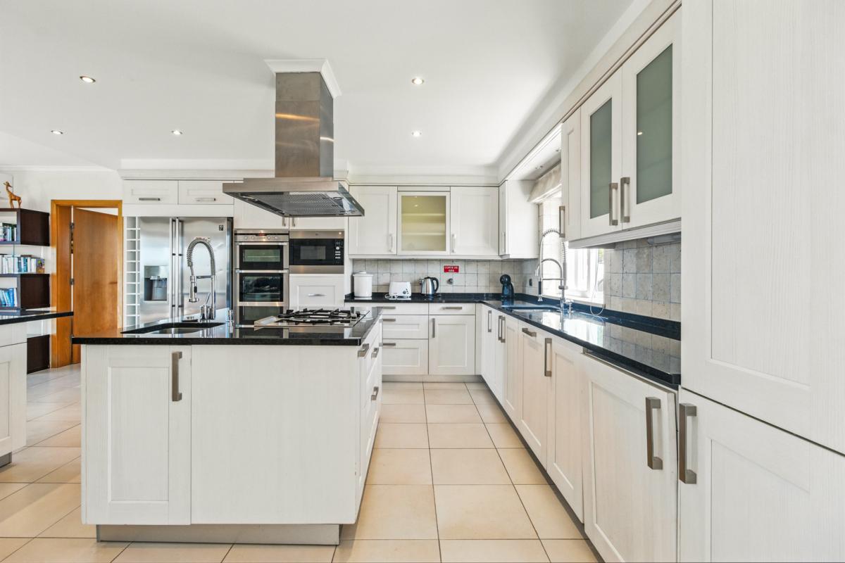 The outdoor space is equally impressive, with a heated swimming pool surrounded by mature gardens and a sunbathing area designed for relaxation.