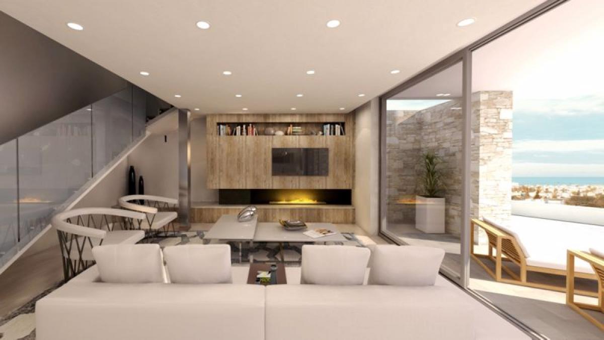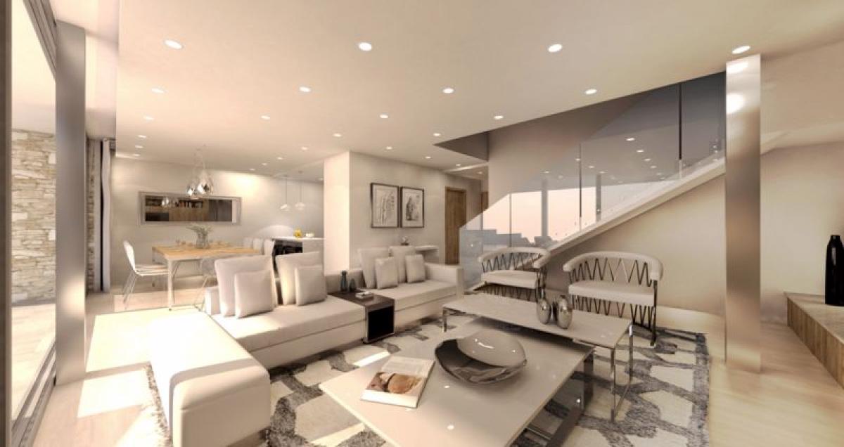 Enter through a large garden into an spacious great room, complete with kitchen island, breakfast bar, dining area, and living room. Large, sliding glass doors open on two sides to a poolside patio, perfect for alfresco dining and relaxation. The infinity swimming pool is 10 m by 3.5 m and has a beautiful view of the garden and area. Upstairs are three large bedrooms, one with an en-suite bathroom and two sharing a family bath. Each have built-in storage and access to a private balcony overlooking the beautiful surrounding countryside. Upstairs a bit further is a large roof garden with panoramic sea views.