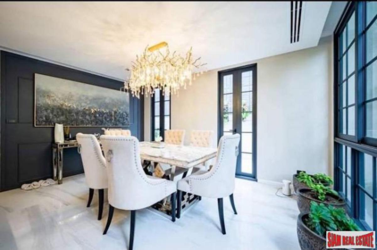 A four bedroom, five bath luxury courtyard villa for sale in a new urban development. The home is 3.5 storeys with a double volume high ceiling living area. There is a modern open western kitchen, a second Thai kitchen and a maid's room with bath. This private villa is well decorated and comes with chandeliers and wood floors.The villa layout is very functional with a private elevator and underground parking with four parking stalls each unit.