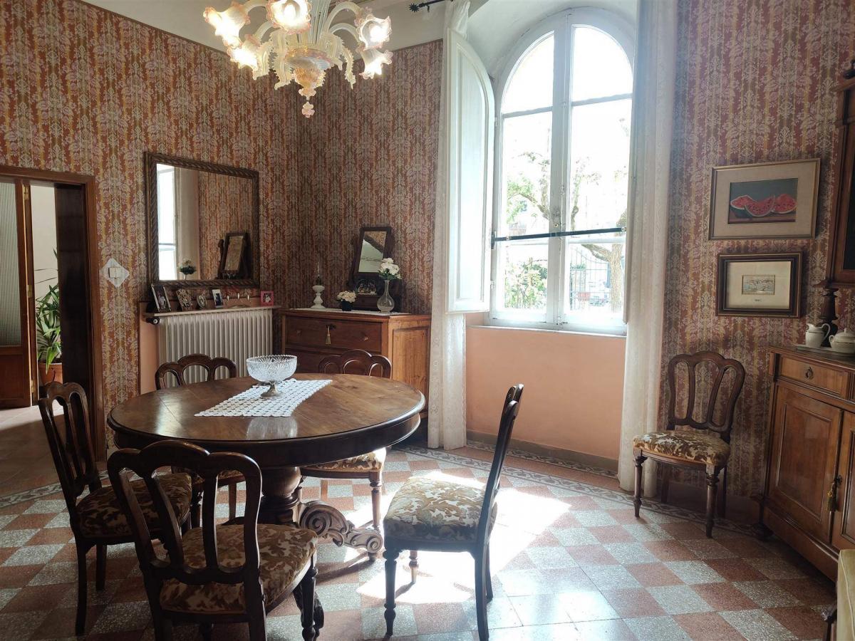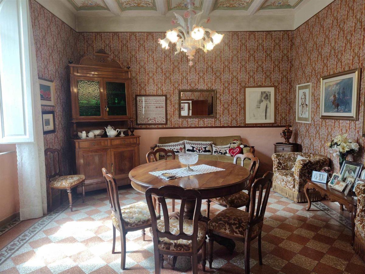 The main residence is set on two levels within a refined early 20th-century villa. On the ground floor are two elegant living rooms, a spacious kitchen with fireplace, a study, and a bathroom, all featuring decorated ceilings and preserved original materials. Upstairs, the sleeping area includes four bedrooms and a bathroom, all connected by a long corridor. A small terrace overlooks the garden and offers a quiet outdoor corner. The annex, spread over two floors for about 180 sqm, features original terracotta floors and exposed beams, and is in need of full renovation.