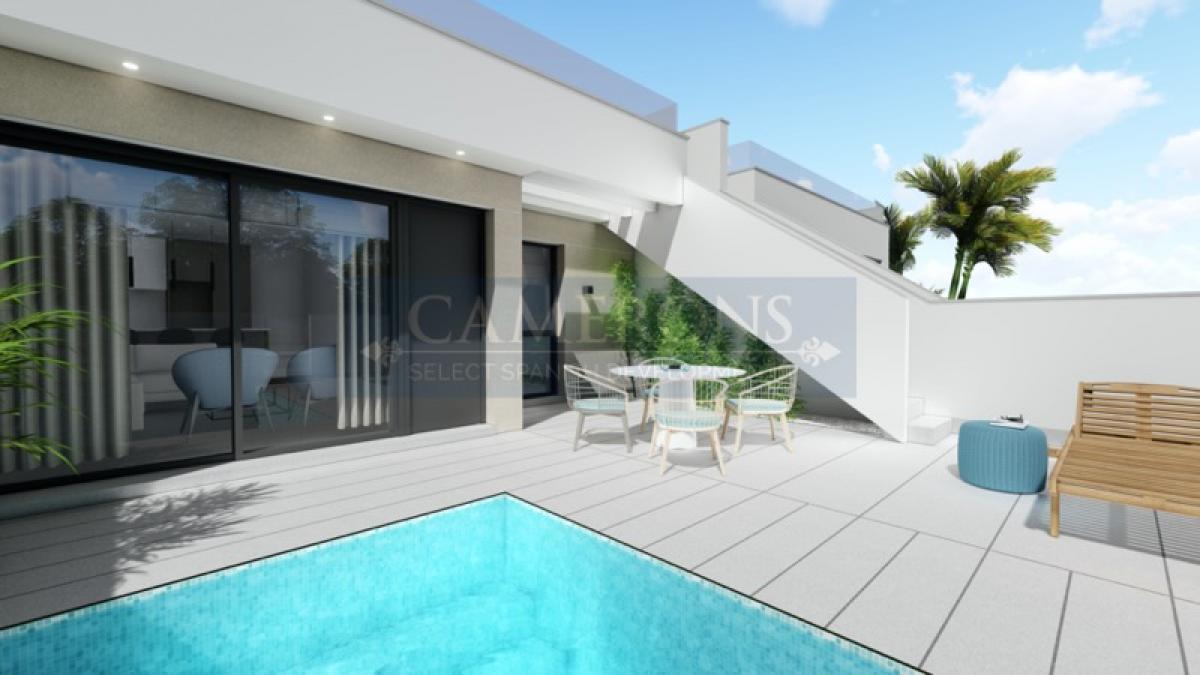 This is a brand new development of modern, high quality, townhouses and villas, with optional private pools in the town of Pilar de la Horadada.As part of the development with different types of properties there are a few units of modern one story terraced villas with 2 and 3 bedrooms and 2 bathrooms and a big solarium on top. The pool is optional from 10.000€ extra.Located just a short walk from the vibrant town of Pilar de la Horadada with a host of great restaurants and all of its amenities. Close to several golf courses and well connected with the AP7 motorway for travel up and down the coast. Murcia's airport (RMU) is 35 minutes, whilst Alicante airport is just a 45-minute drive away.