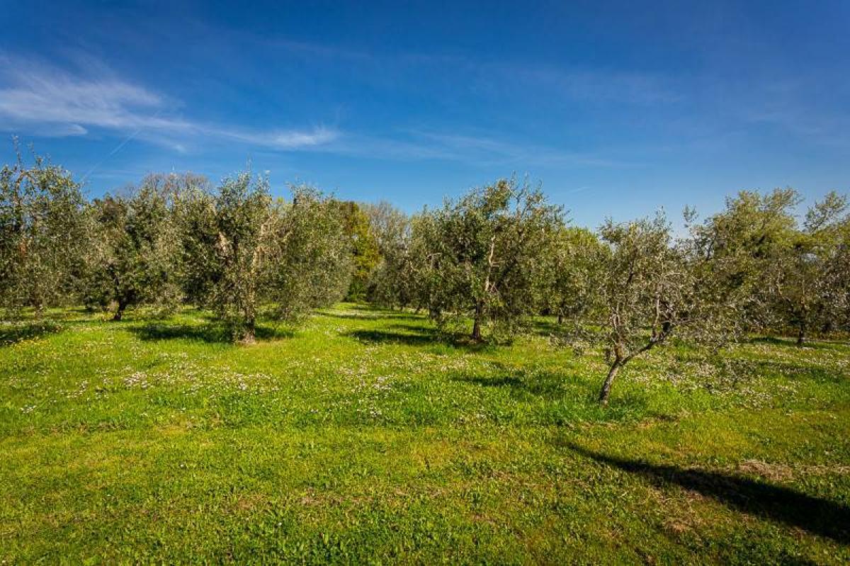 The exterior includes a swimming pool with a solarium set among 350 olive trees and fruit trees, a restored 19th-century oven, a private park, various outbuildings, and a parking area with covered spaces.
