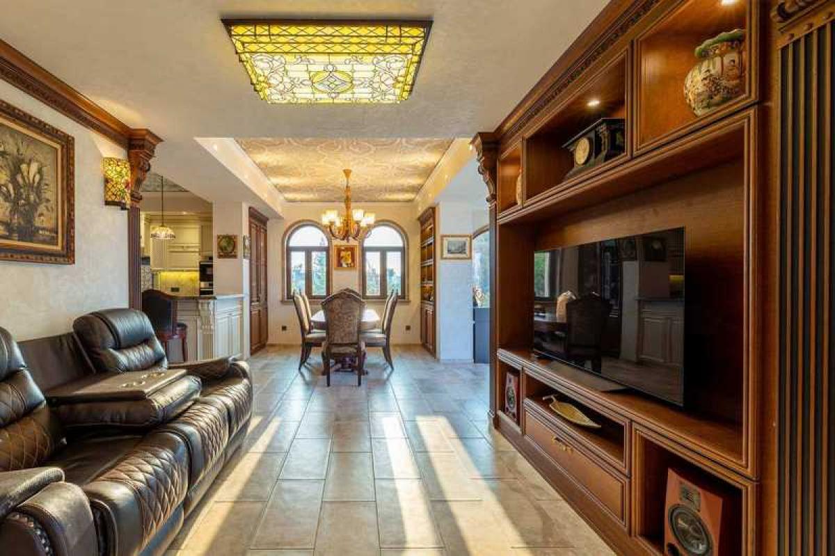 The elegant living area with the large built-in dark oak bar and formal dining room, carved marble stone dining terrace, the fully equipped kitchen and the luxurious billiard room are located on the main level.