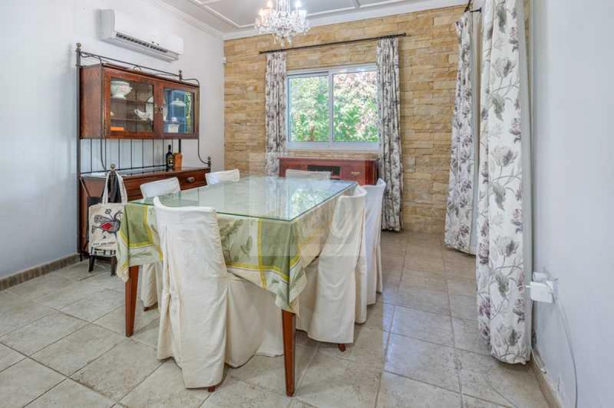 To the right of the hallway is the spacious lounge with an attractive fireplace essential for the short Cyprus winter evenings. The lounge contains two large sofas, a leather armchair, coffee table, side table and TV cabinet. There are double glass door leading out to the garden and swimming pool.
