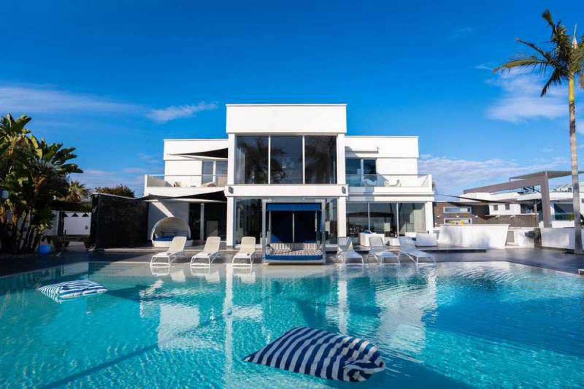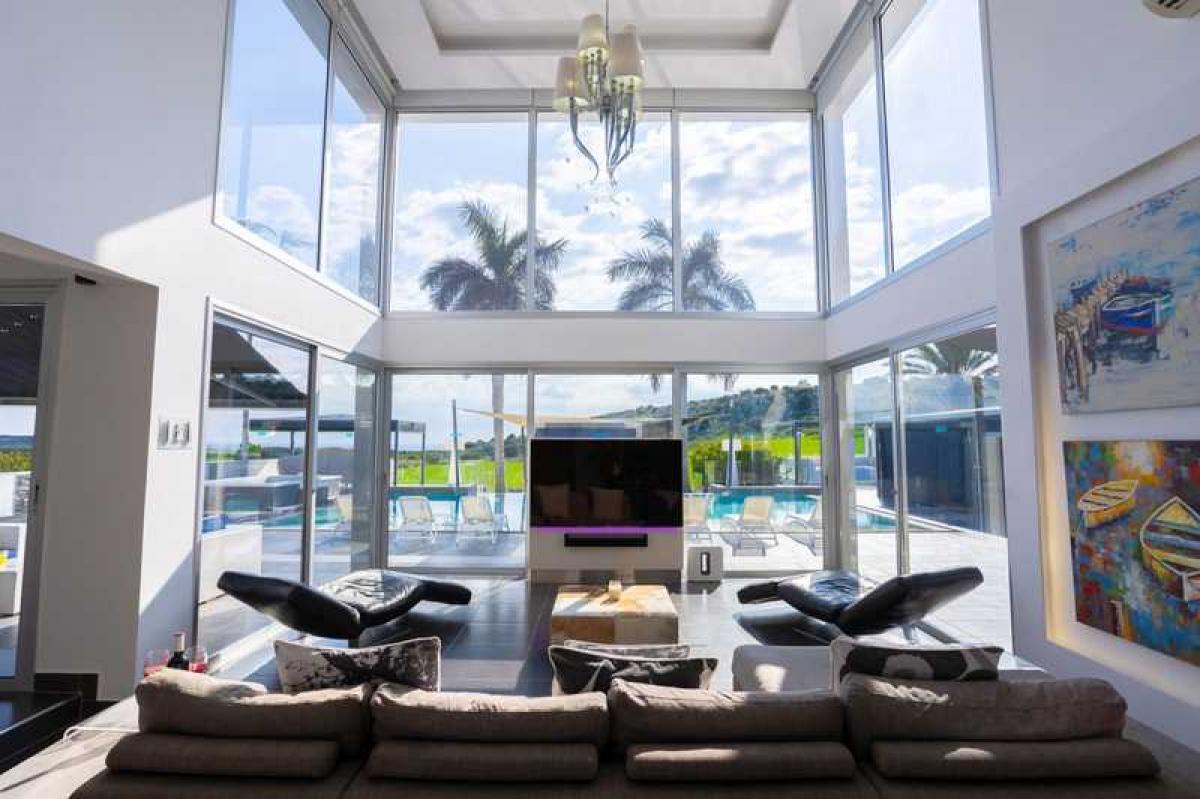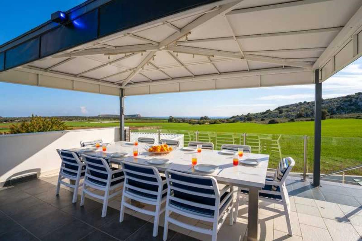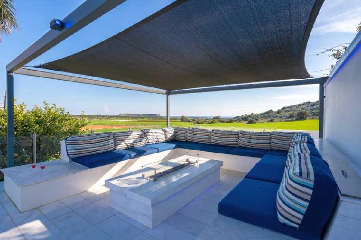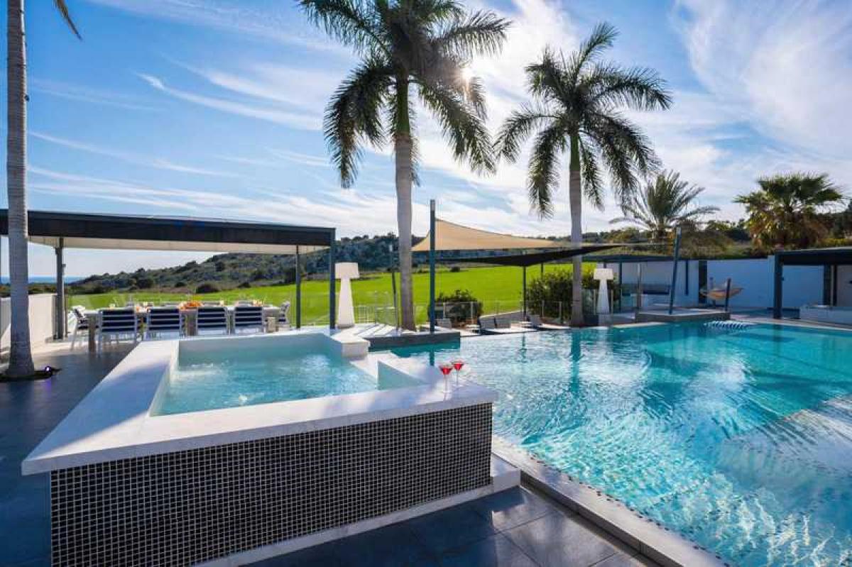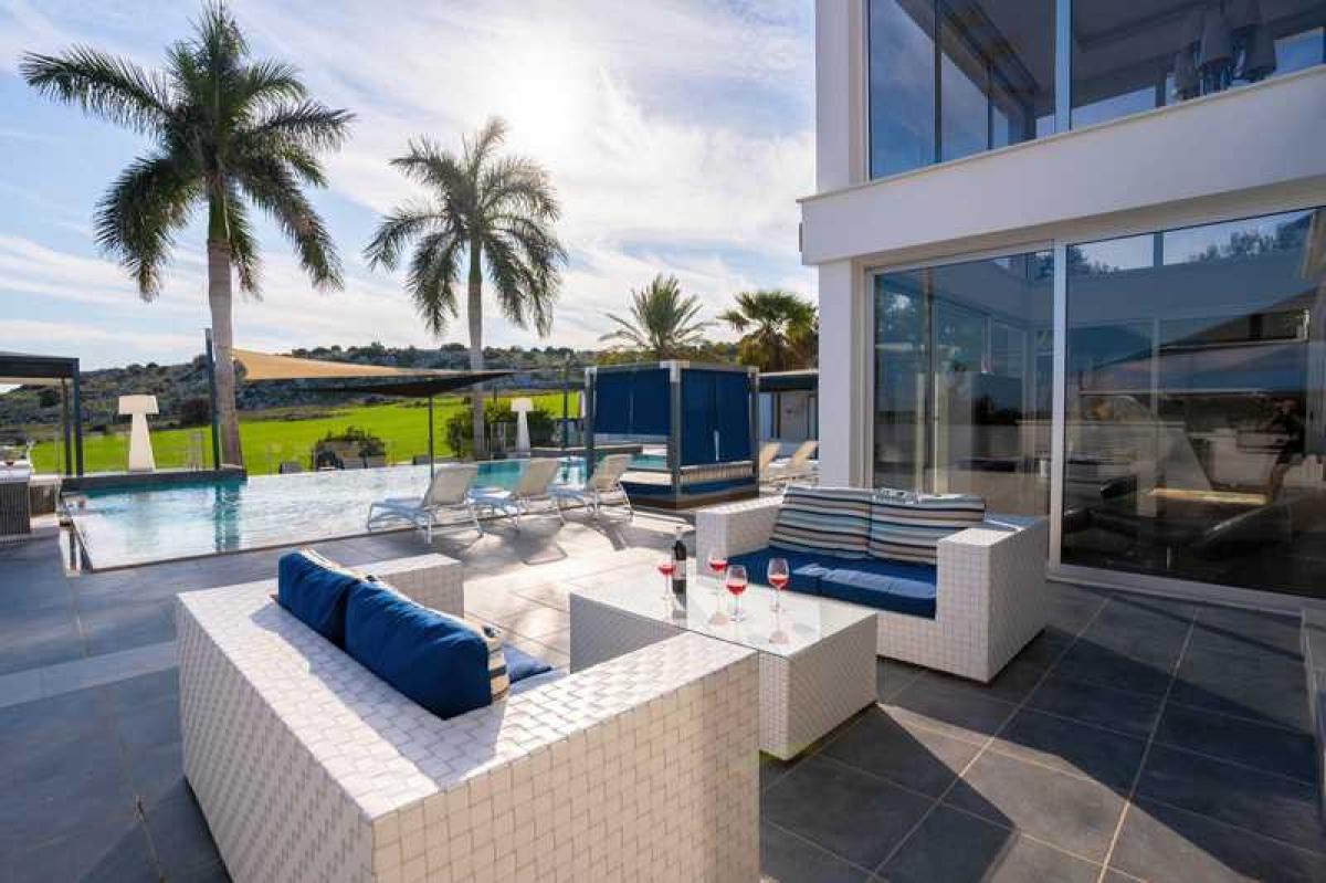 This modern built villa offers the privacy and comforts of a luxury home environment with impressive resort-style amenities, set in a private securely gated 2000 square metre landscaped plot in Protaras, between the famous Konnos Bay and Ayia Napa.The super home with private gated access offers five bedrooms spread over three floors with under floor heating throughout and full AC. On the entry floor you will find an impressive open plan living room with 6m high ceilings, complete with comfortable lounging area, while the open plan kitchen is fitted with professional top of the range branded appliances. The front aspect is glass with sliding doors to maximize the views, leading to the beautiful outside and pool area.