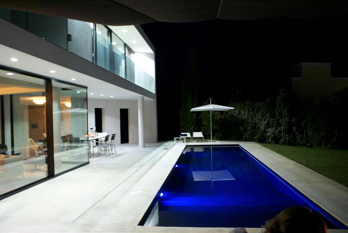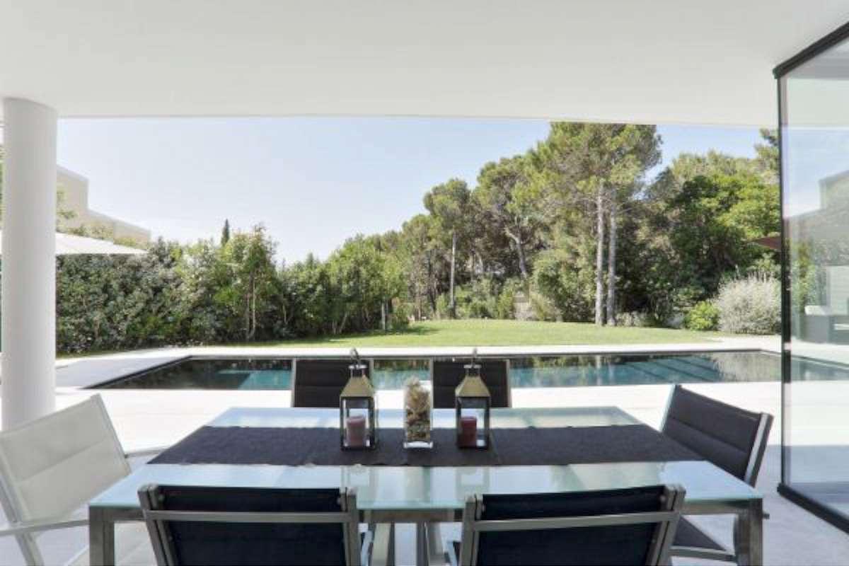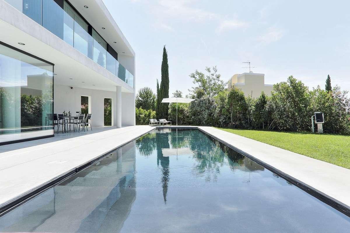Recently constructed, this elegant house has been designed in a beautiful minimalist style, with clean lines, grey tones and great attention to detail. The architecture has been inspired by some of the world's greatest contemporary architects. The master bedroom suite with its parquet flooring, state of the art climate control and bathroom of 40 sqm which includes an outdoor shower, has featured in many architectural magazines for its beauty. The large windows are made of Planitherm glass for climatic efficiency and superb design. The floors on the ground floor are polished concrete or Carrara marble, creating seamless continuity of the interior to the exterior terraces. It is attached to another villa to one side.