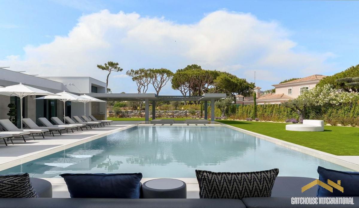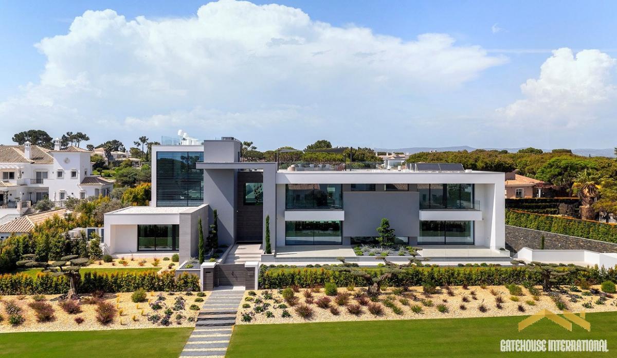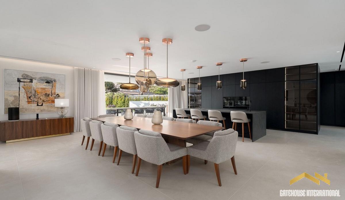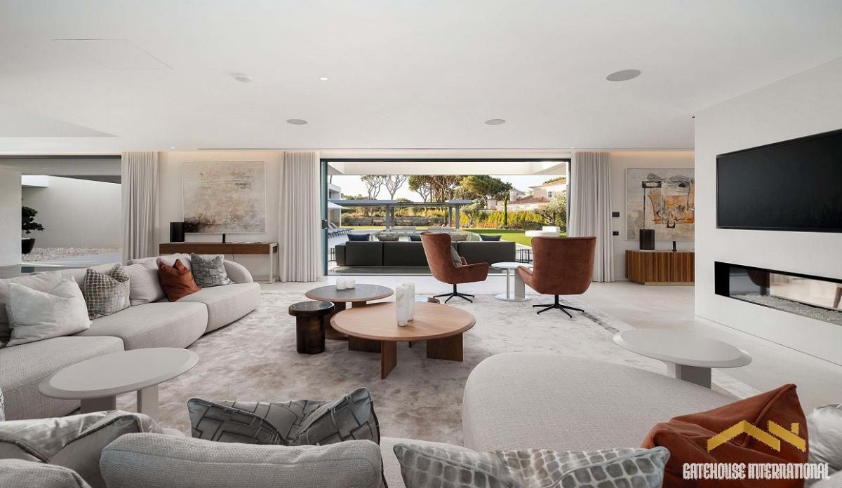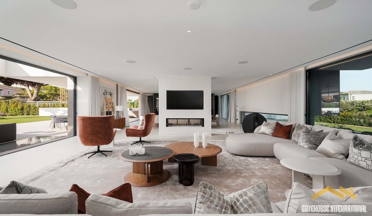 8 Bedroom Algarve Luxury Villa in Quinta do Lago Golf Resort - situated close to the beach, this large 1,421m2 villa within a plot of 2,815m2 has 4 floor levels, including a main 6 bed villa plus a 2 bed self contained guest apartment as well as a cinema room and spa and sport facilities. The ground floor features a double-height entrance with lots of natural light dividing the villa into the living area and the sleeping areas. The large open-plan design features a stylish gas fireplace separating the living room, dining room, and state-of-the-art kitchen, equipped with three ovens and two Bora hobs with a convenient butler's kitchen. This area opens directly onto the outdoor covered terrace and cooking station. The left wing of the property includes a study with an en-suite, the main guest suite and three spacious en-suite bedrooms, each one featuring a walk-in closet and direct access to the pool area. On the first floor, there are two additional bedrooms. One of them is the main bedroom, offering his and hers walk-in closets and bathrooms. it also boasts a private terrace with a cosy seating area overlooking the pool. The second floor features a generous terrace with a lounge area and splendid sea views. The lower level comprises a living area with a bar, a snooker table, and a generously sized wine cellar. There is also a laundry room, two guest bathrooms, a cinema room, a sauna, a steam bath, a massage room, and a yoga studio. This floor also accommodates a full guest apartment with two-bedroom suites, an open-plan living area, and a fully equipped kitchen. The garage provides 2 or 3 parking spaces, both with electric charging stations. Outside, a spacious lounge area by the pool offers the perfect spot for relaxation and soaking up the sun. The stylish fire pit creates a cosy atmosphere for evening gatherings, while the outdoor kitchen makes alfresco dining and entertaining a true delight to the renowned Algarvean lifestyle.