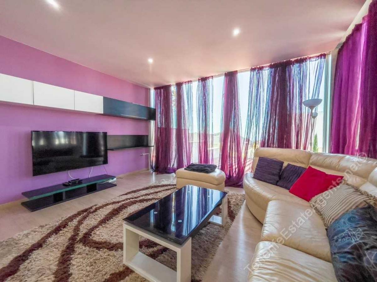 On the main floor there is a large terrace with a private pool, a semi-covered terrace with a dining area and barbecue, a bright living room and kitchen with panoramic windows with access to the terrace, a bathroom and laundry room. On the second floor there are 2 bedrooms, a bathroom, master bedroom suite with its own bathroom and dressing room. All bedrooms have access to a terrace with views of the ocean. There is a large covered parking space on the ground floor. The villa is for sale fully furnished.