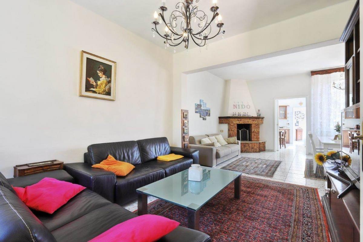 The main entrance opens into a bright, spacious living room, featuring three leather sofas and a dining table for ten. A sliding door leads to the kitchen, which connects to a service bathroom doubling as a laundry area. Upstairs, you'll find two large double bedrooms and a master bathroom. A staircase takes you to the attic, currently used as a bedroom with additional beds and a walk-in closet. This space can easily become a hobby room or another apartment.