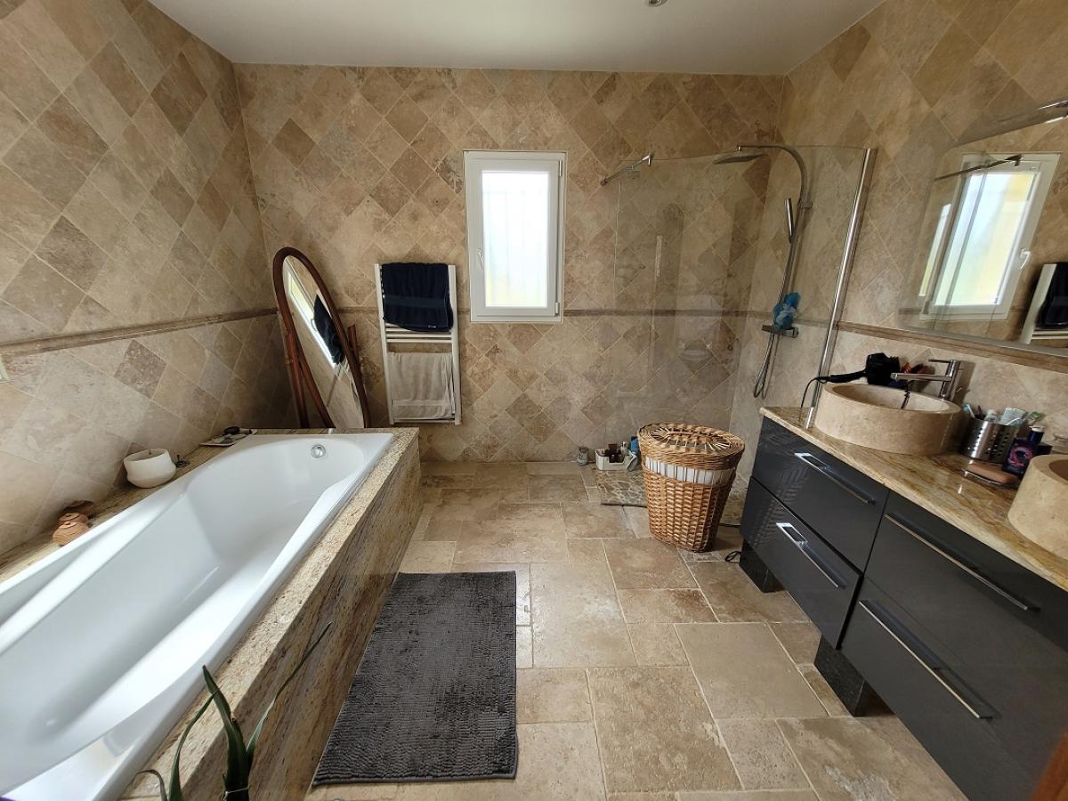 - Ground floor: 5 m2 entrance hall, WC with washbasin, 67.4 m2 lounge/dining room with wall-hung fireplace with sliding doors opening onto a large terrace and swimming pool, 16 m2 fitted kitchen (wall and base units, oven, hob, extractor fan, dishwasher, integrated fryer, fridge), 5.7 m2 cellar, 20.7 m2 en suite bedroom with 9.3 m2 dressing room and 9.9 m2 bathroom (Italian shower, bath, 2 basins, WC), detached garage of 38 m2, veranda of approximately 12 m2.