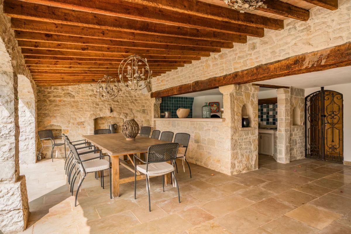 The manicured grounds of 2600m2 have a large heated swimming pool, fully equipped summer kitchen, many shaded terraces, double garage, and carport.