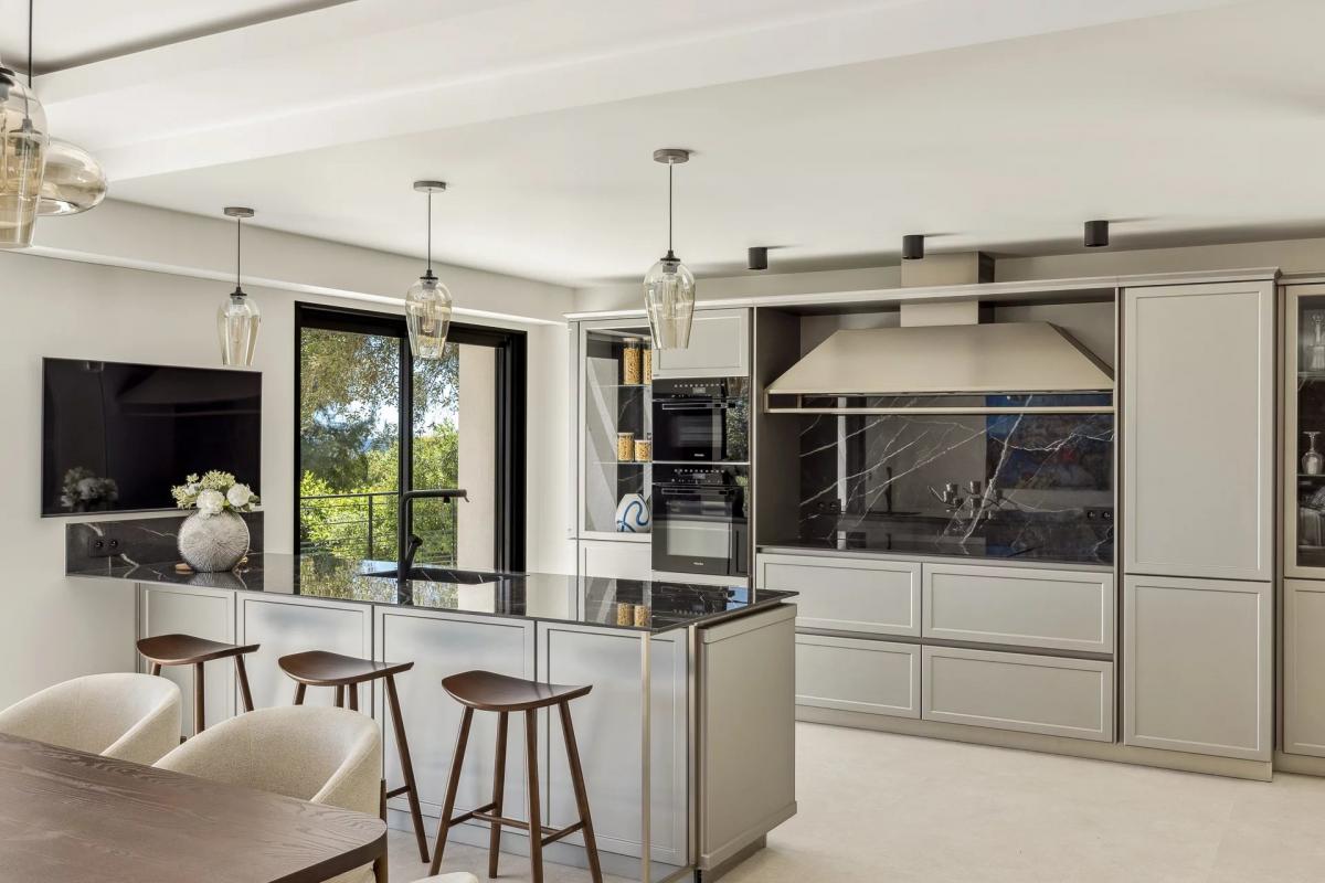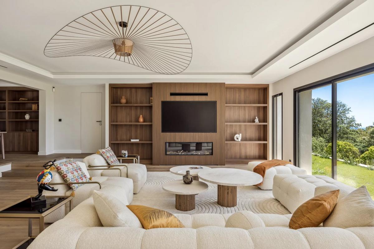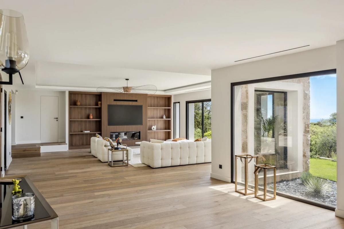 On one level, the house opens onto a vast, luminous living room with fireplace, a fitted kitchen with pergola, a library, a storeroom and a master suite. Upstairs, four further suites with sea views, terraces and dressing rooms ensure comfort and privacy.