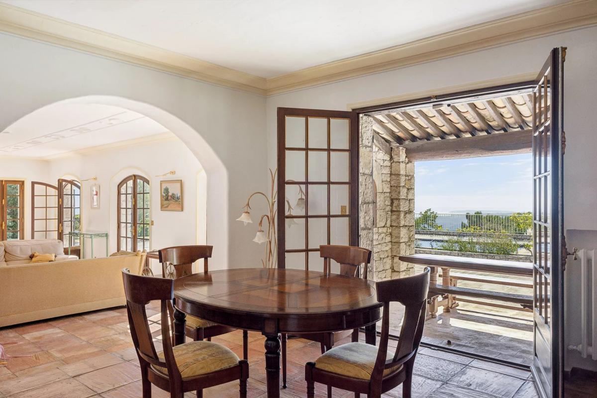 in erhohter und ruhiger Lage im prestigetrachtigen Hauts de Saint-Paul Sicherheitsanwesen bietet diese Villa mit einer Steinfassade im provenzalischen Stil aus Stein, entworfen von einem renommierten Architekten, atemberaubende Panoramameerblicke bis zum Cap d'Antibes.