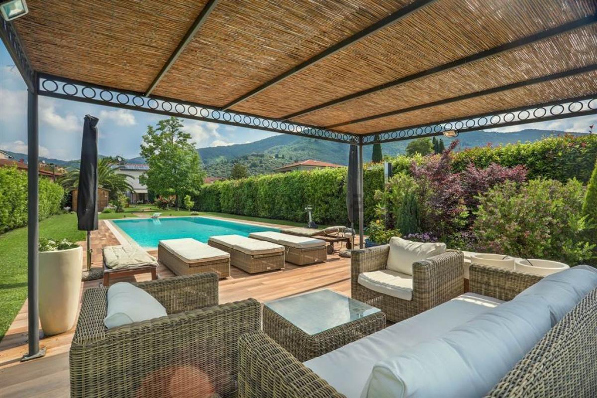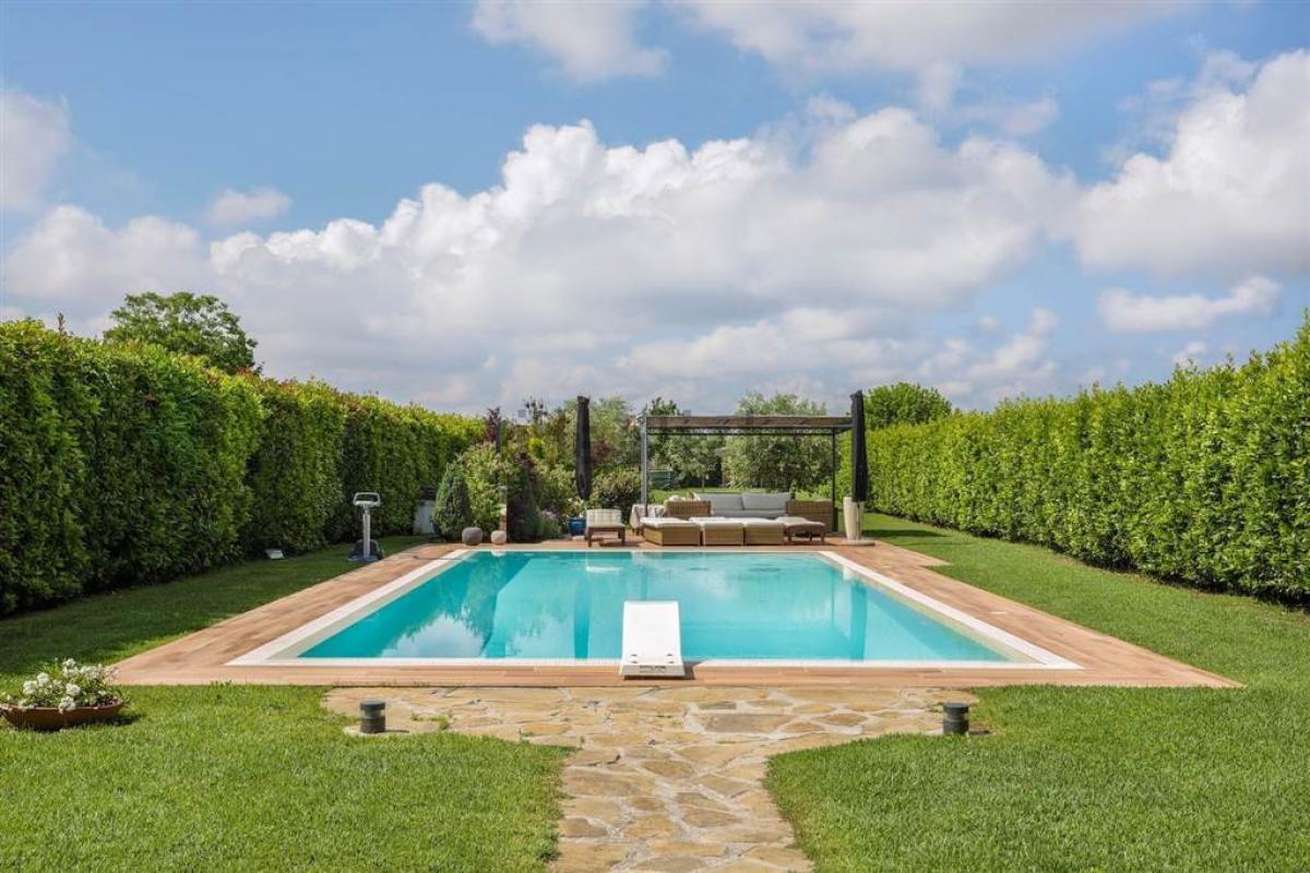 Outdoors, the property is surrounded by a private garden of approx. 1,800 sqm, fully fenced and equipped with a well and irrigation system. The 12 × 6 m swimming pool, featuring a saltwater filtration system for sustainable maintenance, is complemented by a relaxation gazebo, perfect for convivial moments in total privacy.