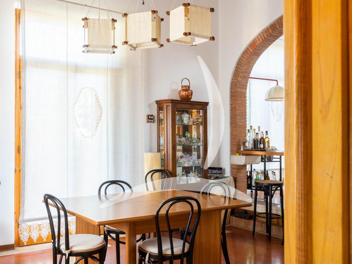 The main entrance opens to a large living room with over 5-meter ceilings, exposed wooden beams, and a striking central fireplace, the heart of the home. Natural light floods the space, creating a warm and welcoming environment. An elegant staircase in wood and wrought iron leads to the upper floor, where there are three spacious bedrooms, a bathroom, and a covered porch overlooking the garden.