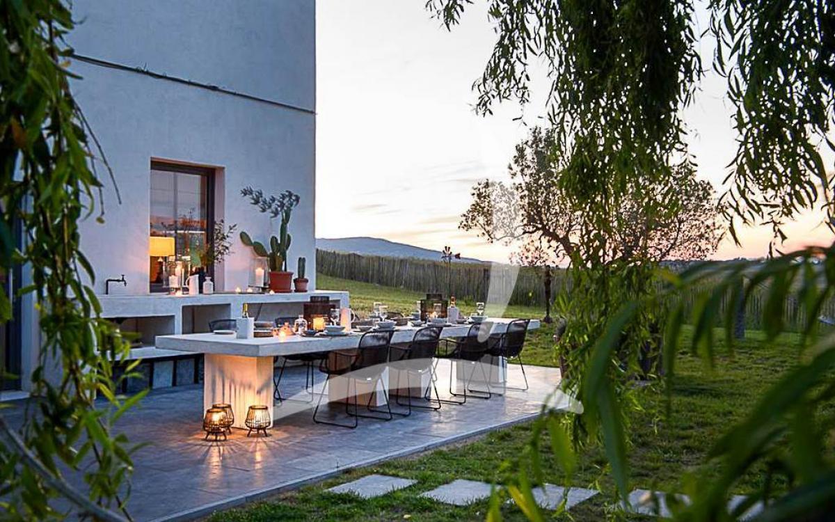 The villa is surrounded by approximately 4,000 sqm of landscaped, fenced gardens featuring a 9 x 5 m swimming pool with an automatic filtration system, a panoramic terrace with dining and lounge areas, an authentic wood-fired pizza oven, and an outdoor bathroom. There is also ample parking space and the possibility of purchasing additional adjoining land currently part of a protected natural reserve.