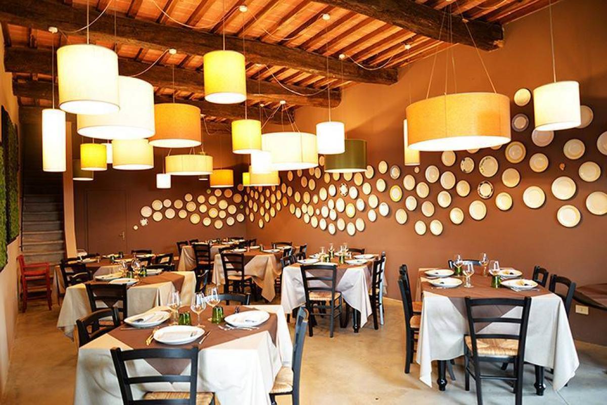 The complex covers 1200 sqm and includes a residence with 6 renovated apartments in traditional Tuscan style, a welcoming reception area, and a ground-floor restaurant featuring vaulted ceilings and exposed beams. The restaurant is equipped with a professional kitchen and opens onto a stunning panoramic terrace through a glass door.