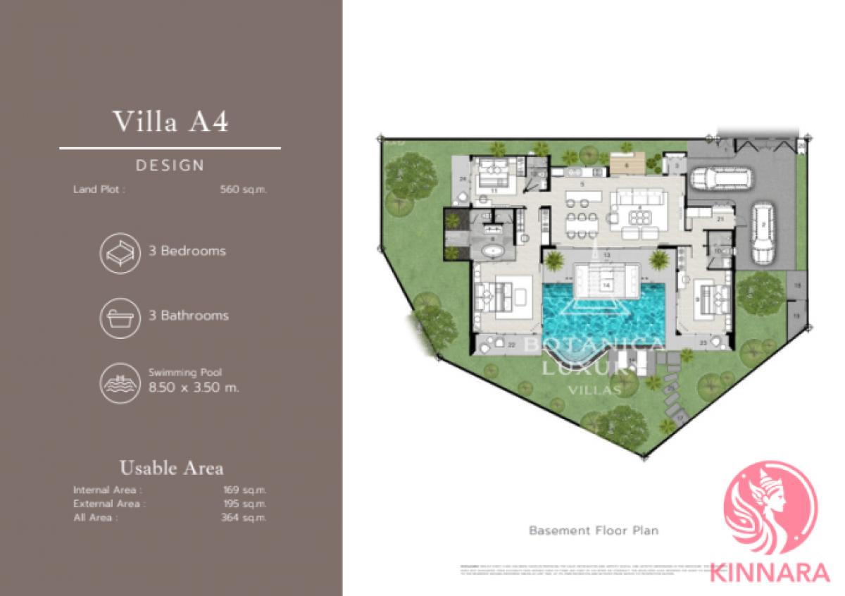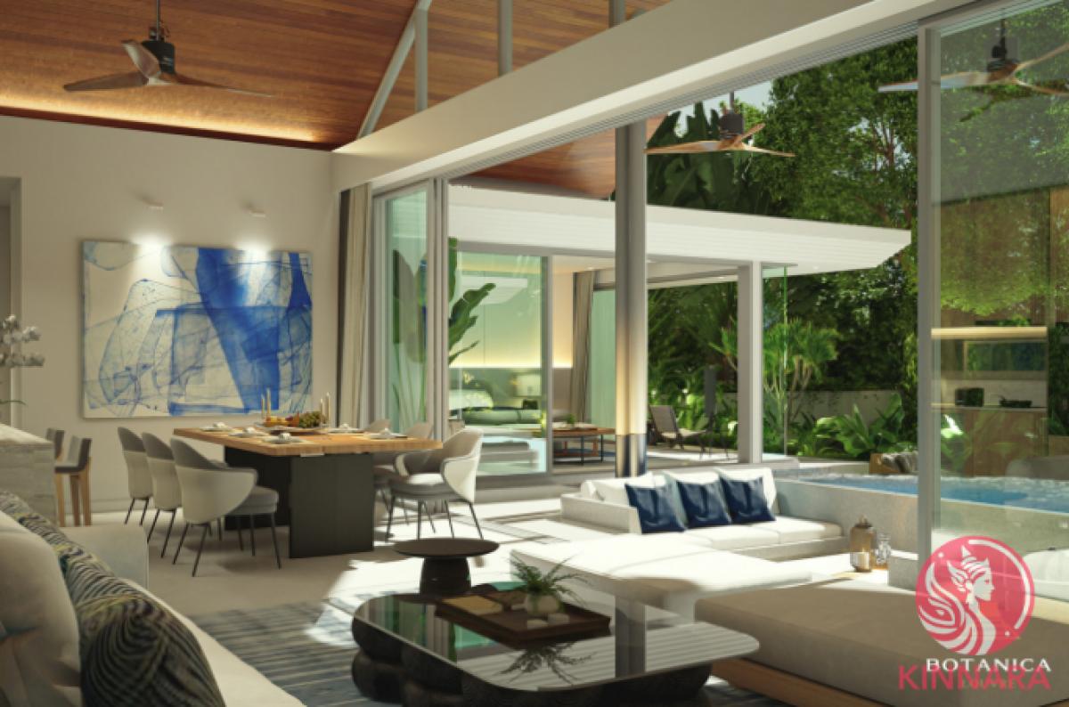 Botanica Louvre Type A4Nestled in the sought-after Pasak region of Cherng Talay, Louvre Villa offers a collection of stylish pool residences perfect for those seeking a permanent family home or an investment property for vacation rentals. This upscale development consists of 8 contemporary single-story villas, each boasting a unique U-shaped design centered around a private pool. Inside each villa, youll find a bright and airy open-plan living and dining area that seamlessly flows into a modern kitchen complete with a breakfast bar. The layout includes three inviting bedrooms, with both the master suite and the first guest bedroom providing direct access to the pool and luxurious ensuite bathrooms. The master bathroom stands out for its spaciousness, featuring a separate bathtub, shower, and an indulgent outdoor shower experience. The second guest bedroom shares a convenient shower bathroom with the main living space. The living and dining area impresses with its high gable ceiling, creating an expansive ambiance that opens up to a generous pool terrace featuring sunken seating by the waters edgean ideal spot for relaxation and entertainment.