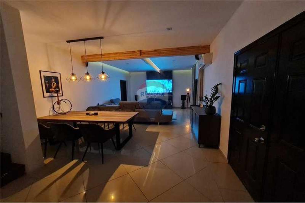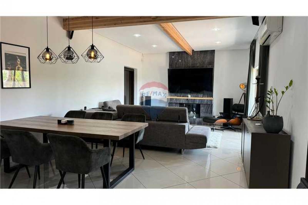 On the ground floor, there is an open plan fully renovated modern kitchen, a beautiful cozy living room with a fireplace, a dining area, a guest W.C., and one en-suite bedroom. On the upper level are 2 bedrooms (one is en-suite) and a spacious covered veranda.
