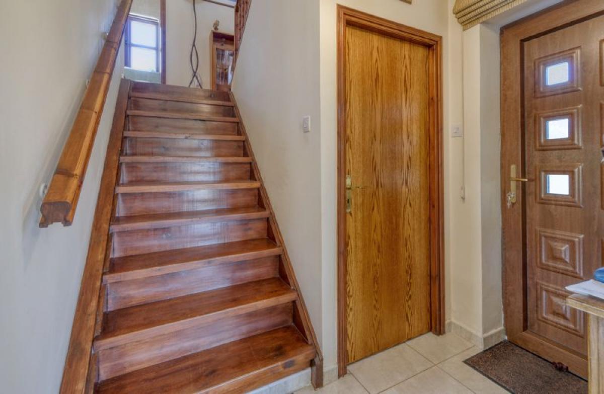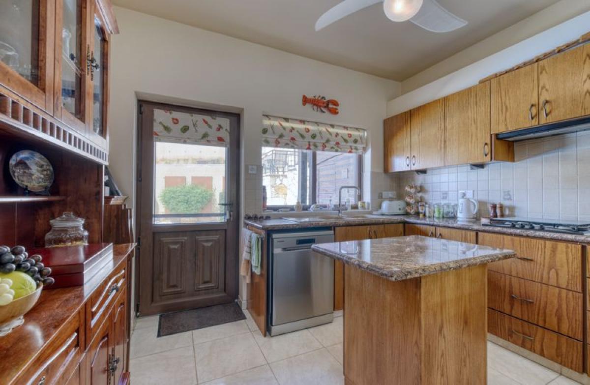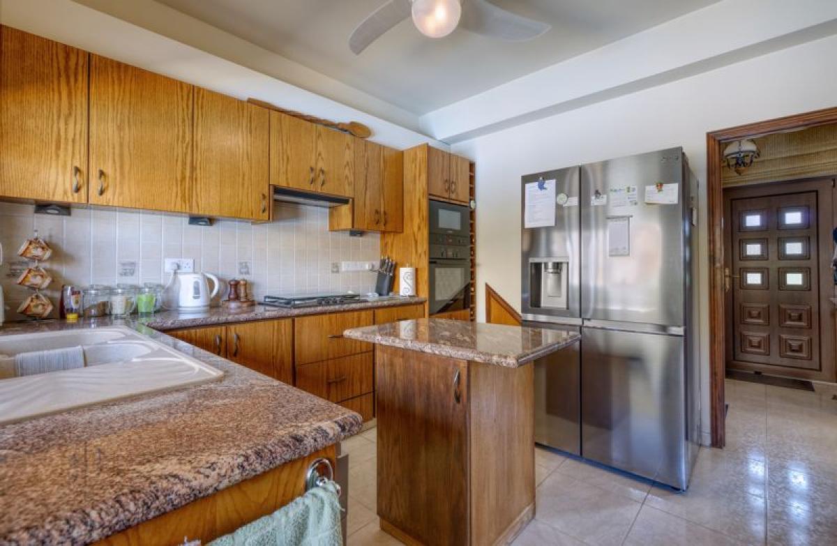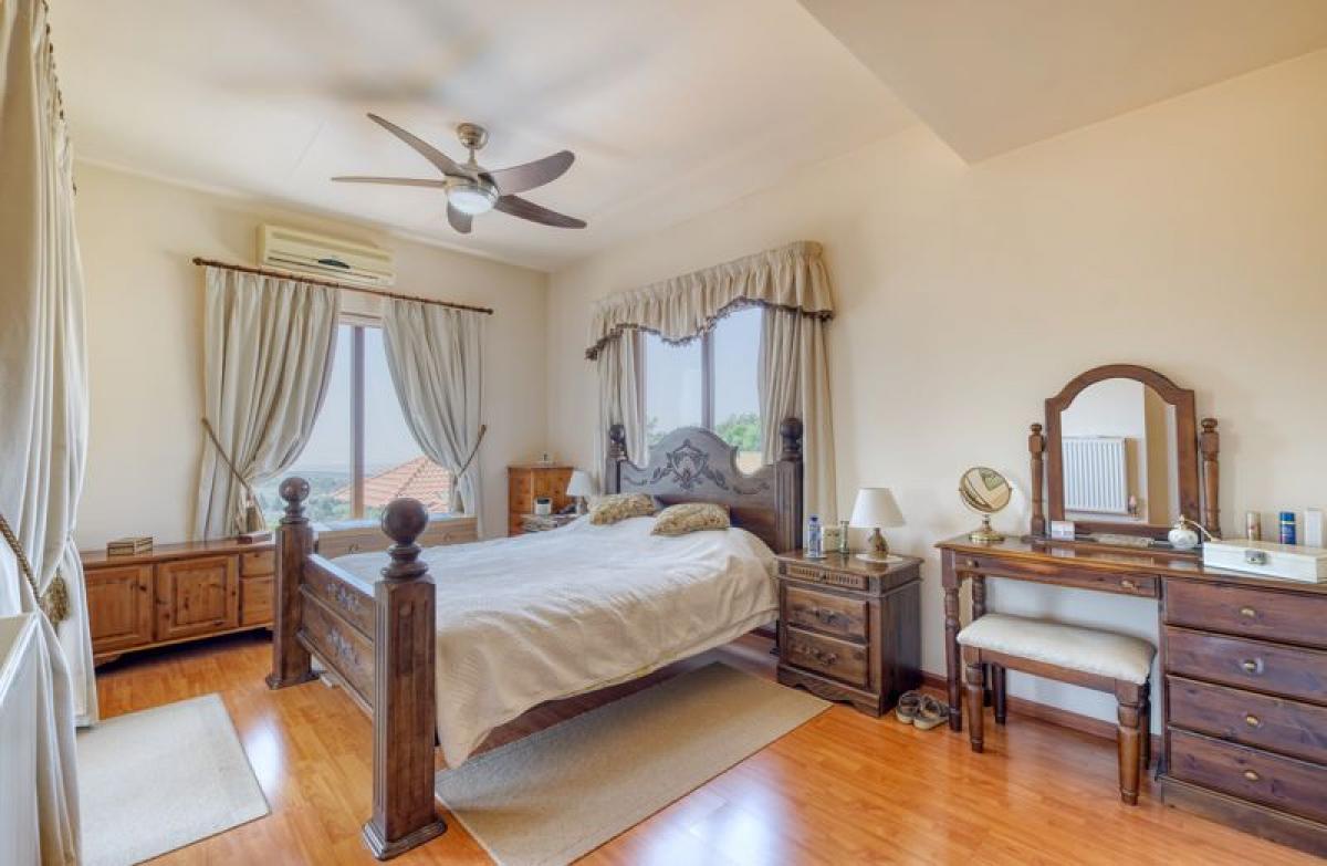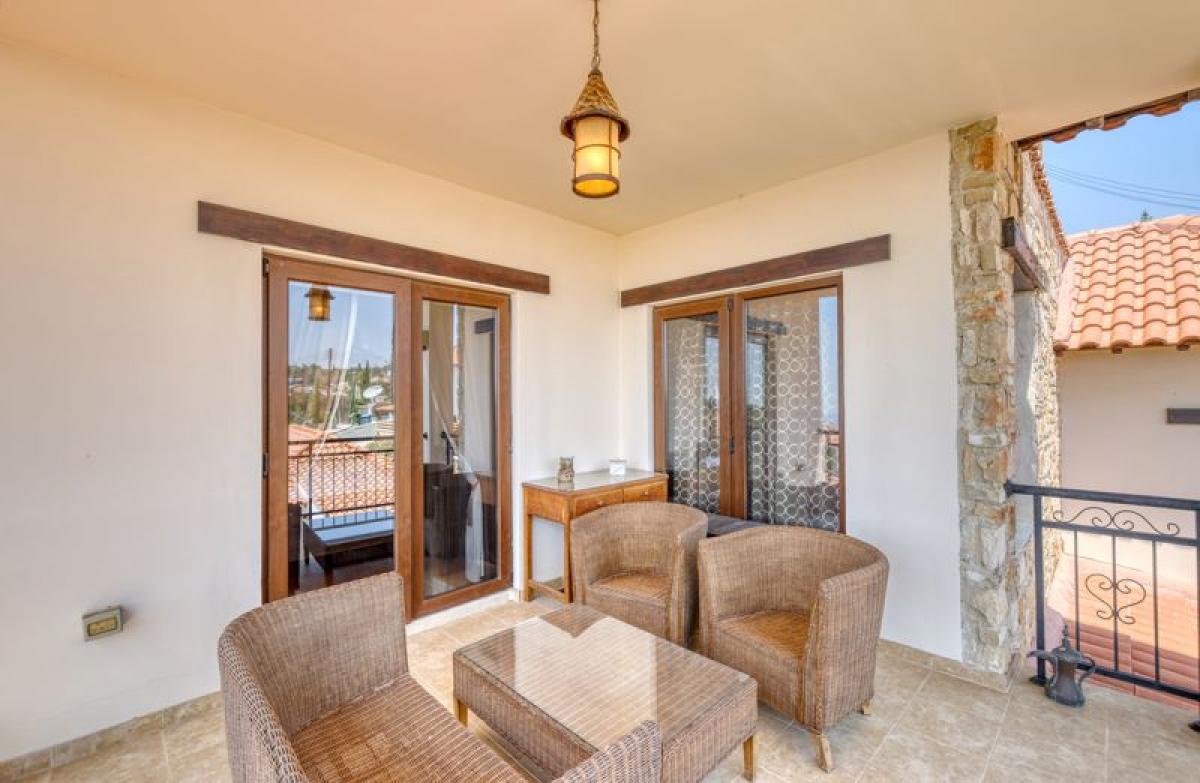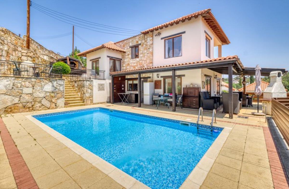 The property blends Mediterranean architecture with modern comfort, offering an entrance with porch, open-plan living/dining area with gas fireplace and access to the front covered veranda, separate fully equipped kitchen with plumbing for appliances, three large bedrooms upstairs, whilst master bedroom has ensuite facilities and access to private balcony with stunning views over the surrounding areas. Also tilled family bathroom and separate WC. Outside the villa you will find an expansive verandas with low maintenance gardens, private swimming pool with outdoor shower, outdoor traditional built BBQ and Cypriot style oven, dining area with wooden pergola and three outbuildings /storage. On the lower level you will find a gated driveway with car port.