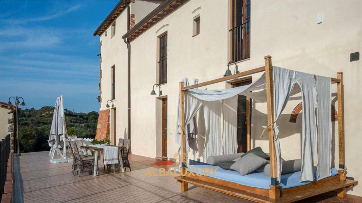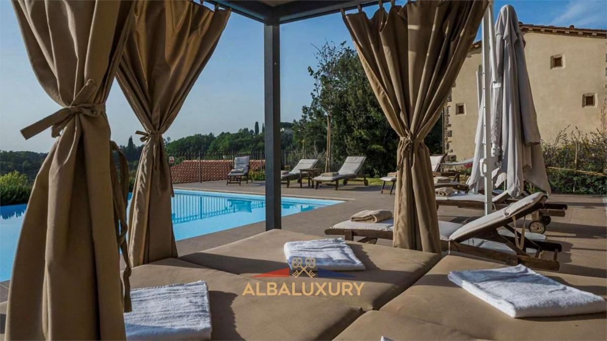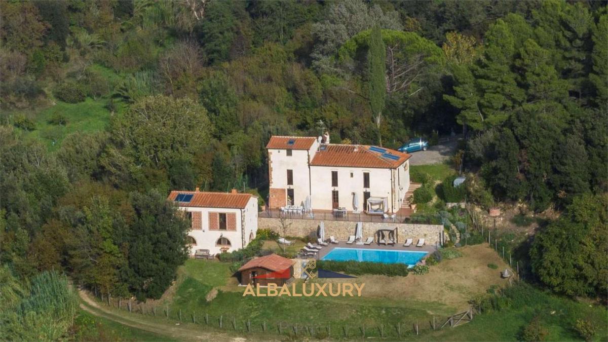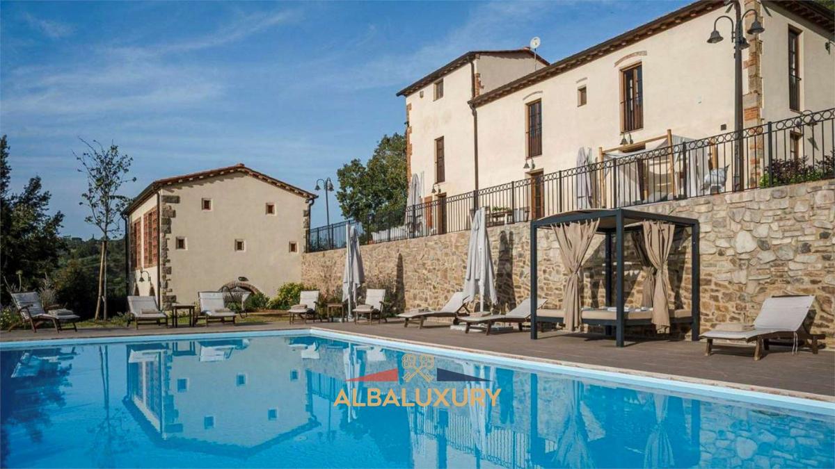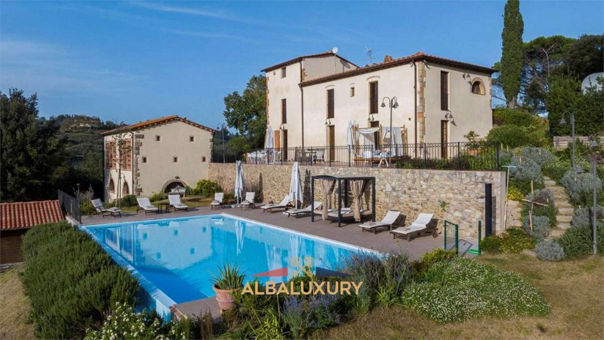Magnificent property in the quiet and charming countryside of Palaia, where this extraordinary 500 sqm residence stands on a vast 8 hectare plot, embracing unspoilt nature and offering breathtaking views of cultivated fields, woods and ancient farms. Main Features:^Main Villa: A sumptuous 350 sqm mansion, elegantly distributed over two floors. The first floor hosts a delightful living room with fireplace, four bedrooms with en-suite bathrooms, one of which has a turret converted into a refined space with a double sofa bed and armchair. On the ground floor, there is a spacious kitchen with an island, located under the original archway of an old manger, dining room, large living room and a fully equipped gymnasium. The ground floor is completed by a bathroom and a fully equipped laundry room. Additional facilities include a barbecue, wood-burning oven and a full entertainment system with stereo, WI-FI, satellite TV, air conditioning and heating. Infinity Pool: Immersed in a dreamlike setting, a large swimming pool (12 m x 6.5 m) surrounded by ample space and high-quality garden furniture, offering an oasis of relaxation with panoramic views. Annexe: A second 150-square-metre building, the barn, offers a bright living room on the ground floor with a large arched door overlooking the wooded valley, a kitchen and upstairs two double bedrooms with en suite bathrooms. Outside, a generous barbecue for outdoor grilling and a fully equipped kitchen. The property boasts 8 hectares of land, including woods, olive groves and fruit trees, creating an idyllic setting for relaxing walks and connecting with nature. The outdoor spaces are complemented by a barbecue, wood-burning oven and areas for enjoying the outdoors. This prestigious residence represents a rare opportunity to embrace a luxurious lifestyle in a natural and historic setting. Exclusive property in the countryside of Palaia.,